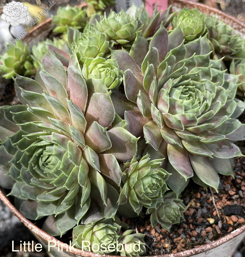 Sempervivum 'Little Pink Rosebud' ist ein im Zentrum kräftig gefärbter Hauswurz. Der Rosettendurchmesser liegt bei 9cm und ist nicht gerade klein, wie man es aus dem Namen entnehmen könnte! Vielleicht sind auch die vielen pinken Ableger gemeint, die willig gebildet werden. Eine wüchsige Pflanze, die schnell dichte Polster bildet.