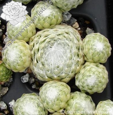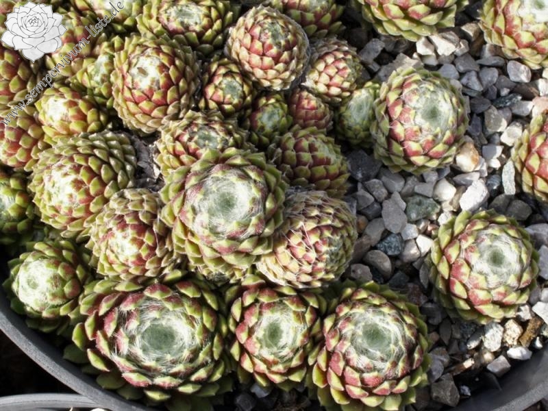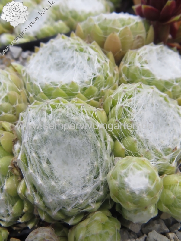 Sempervivum 'Lore' ist eine sehr wüchsige Spinnweb-Züchtung, die mir besonders im Sommer gut gefällt. Die kräftig weiß besponnenen Rosetten zeigen dann nur noch einen hellgrünen Rand. Sehr schön!