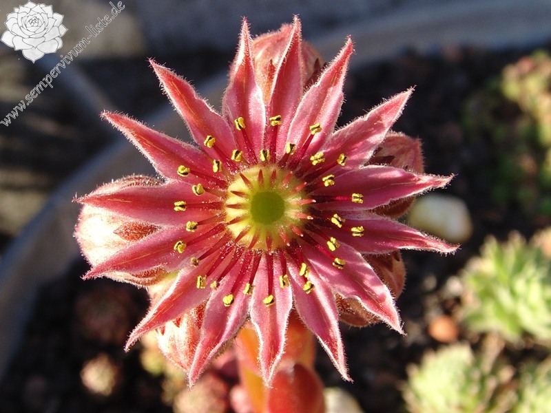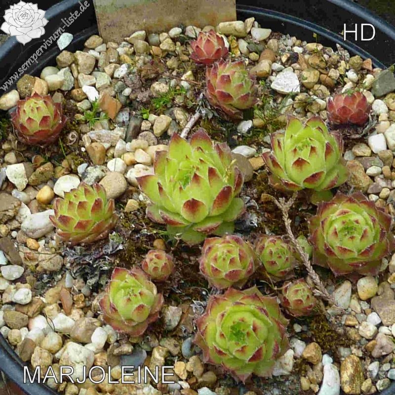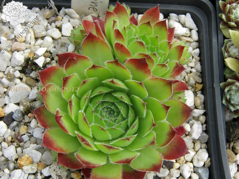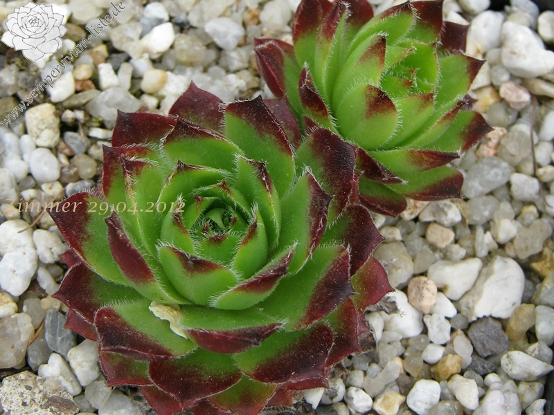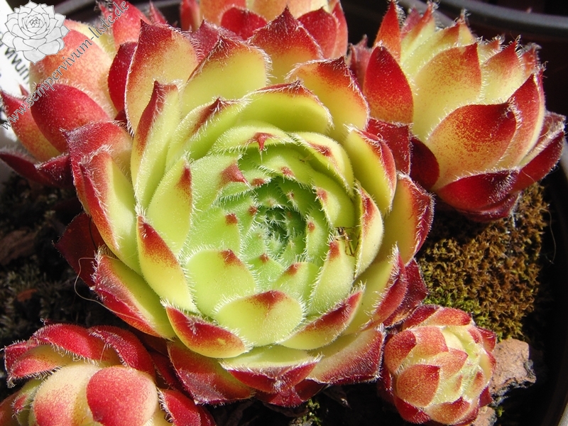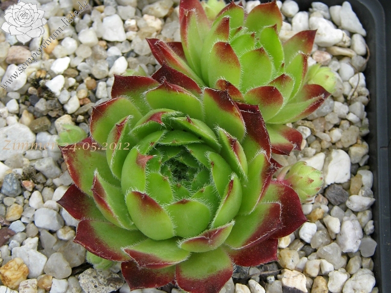 Rosetten bis 5 cm, Blätter oval, kurz bespitzt, gelbgrün, Spitzen braunrot