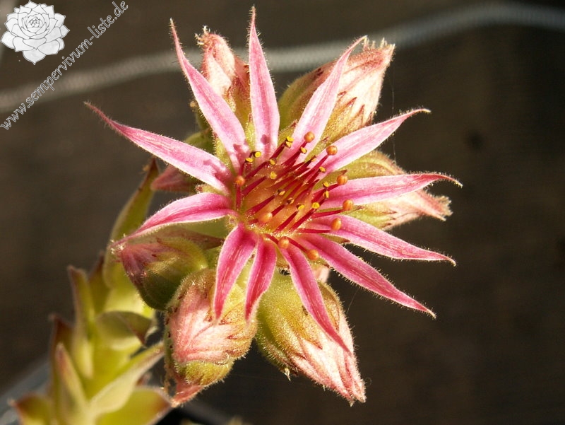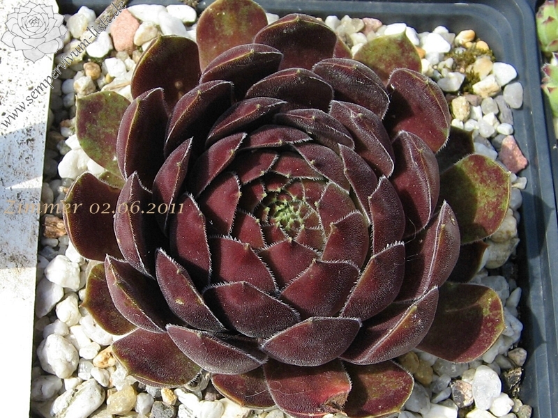 Absaat von 'Clevland Morgan'. Sehr schwer zu beschreibende Färbung. Sehr dunkle, grün-rote, kompakte Rosetten mit grünen Blatträndern. Mitte Mai färben sich die Rosetten dann lila-rot, wobei der schmale Rand seine grüne Färbung behält. Die Rosetten erreichen einen Durchmesser von 7 cm. Die Blätter stehen in den Sommermonaten fast senkrecht nach oben. Eine willig sprossende Hybride.