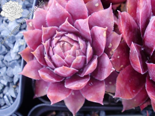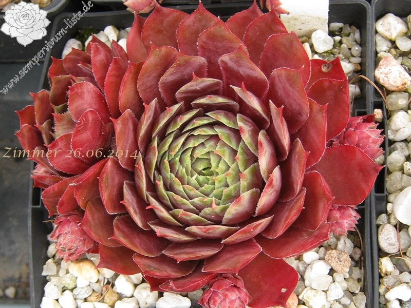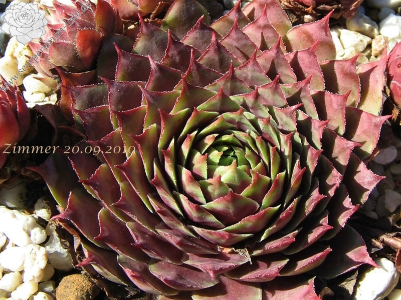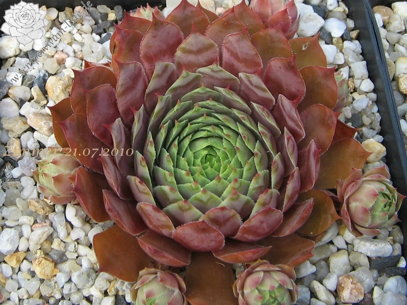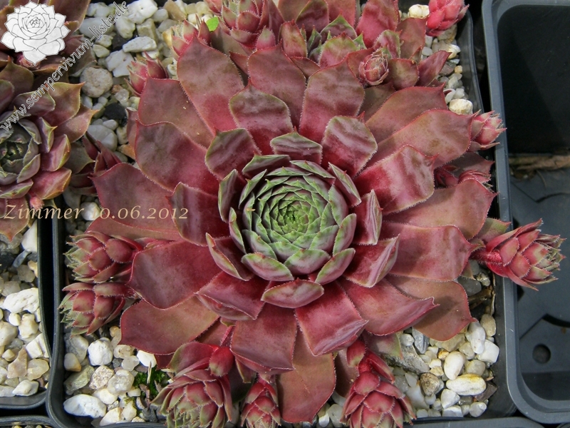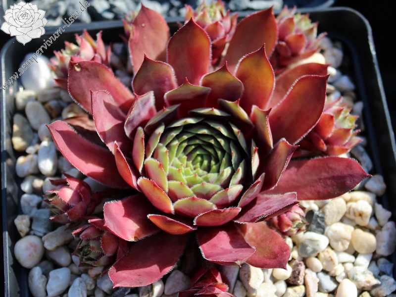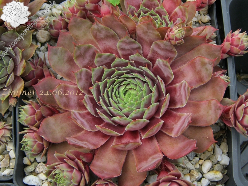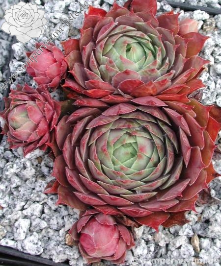 Große Rosetten mit roten Tönen. Eine relativ neue Hybride aus Deutschland mit großen Rosetten in verschiedenen roten Tönen geschmückt. Auffallend in der späten Jahreszeit ist die knospige Mitte in pastellgrüner Farbe. Vermutlich von S. wulfenii vererbt.