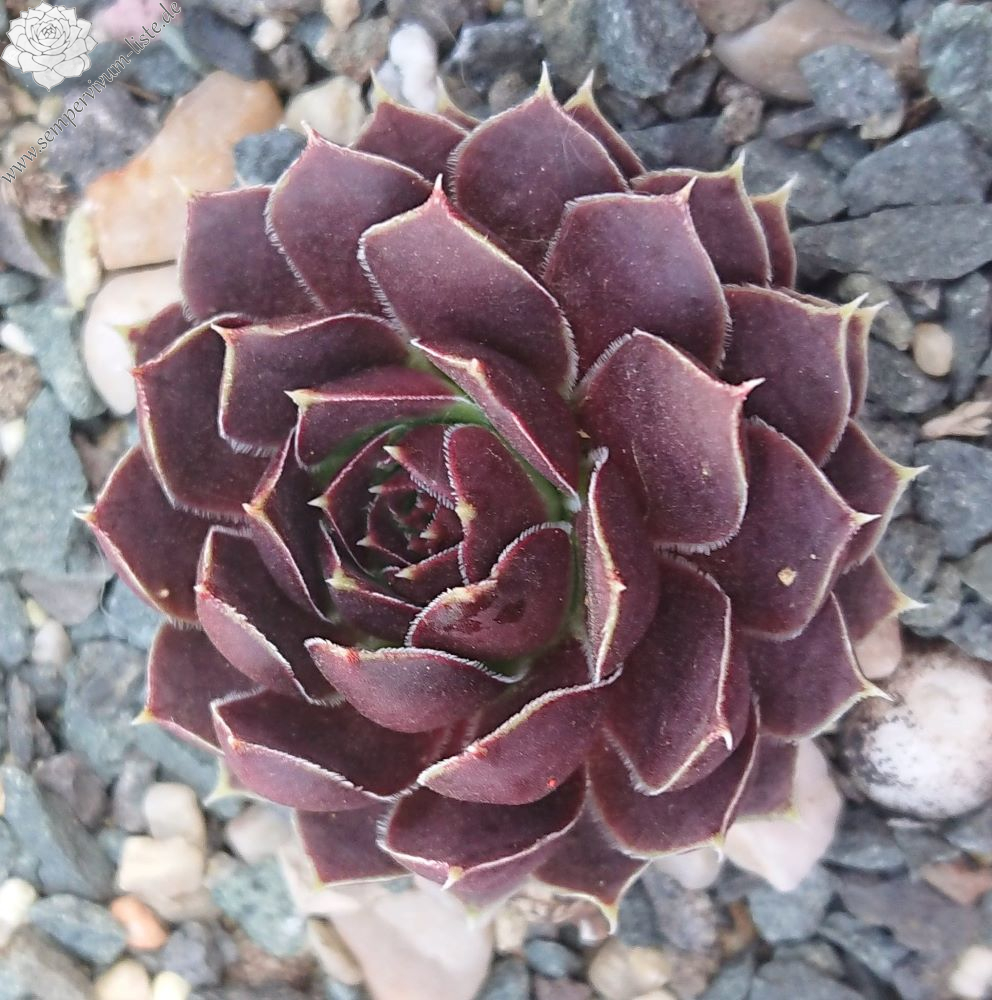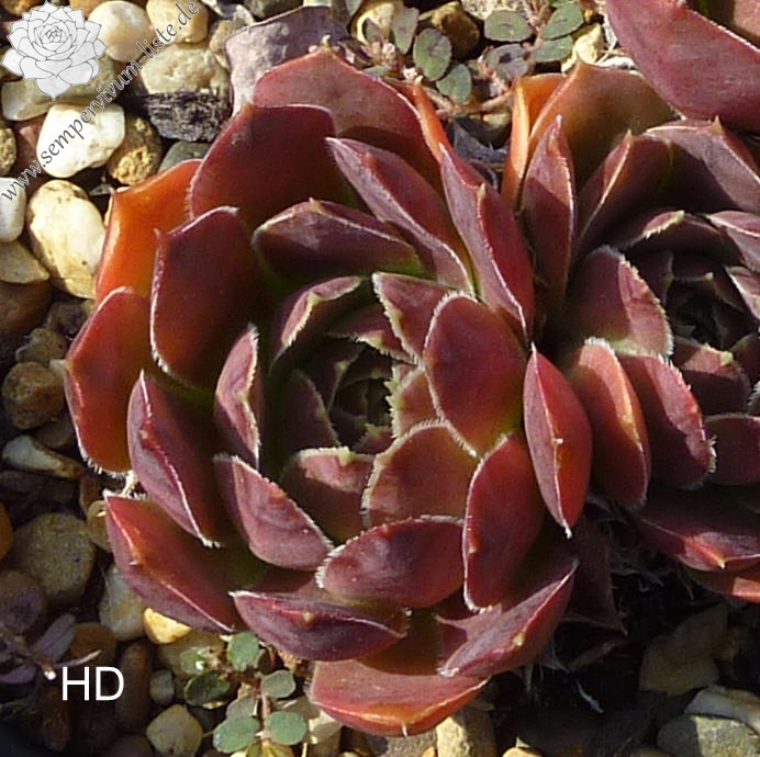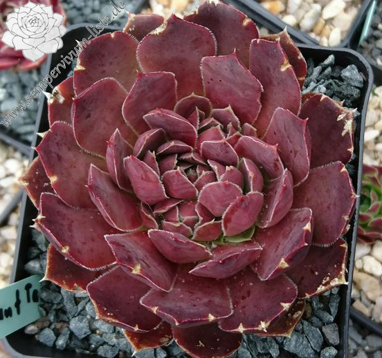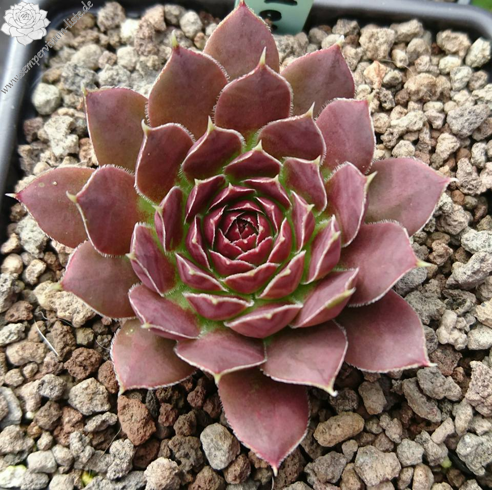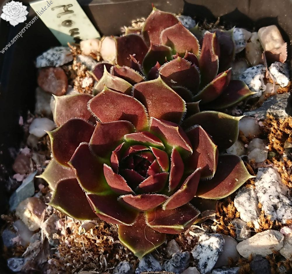 Rosetten 5 cm, keilförmige Blätter, kurz bespitzt, dunkles Weinrot