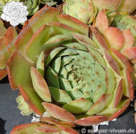 Rosetten bis 5 cm, Blätter oval - rundlich, kurz bespitzt, gelbgrün mit rötlichen Spitzen