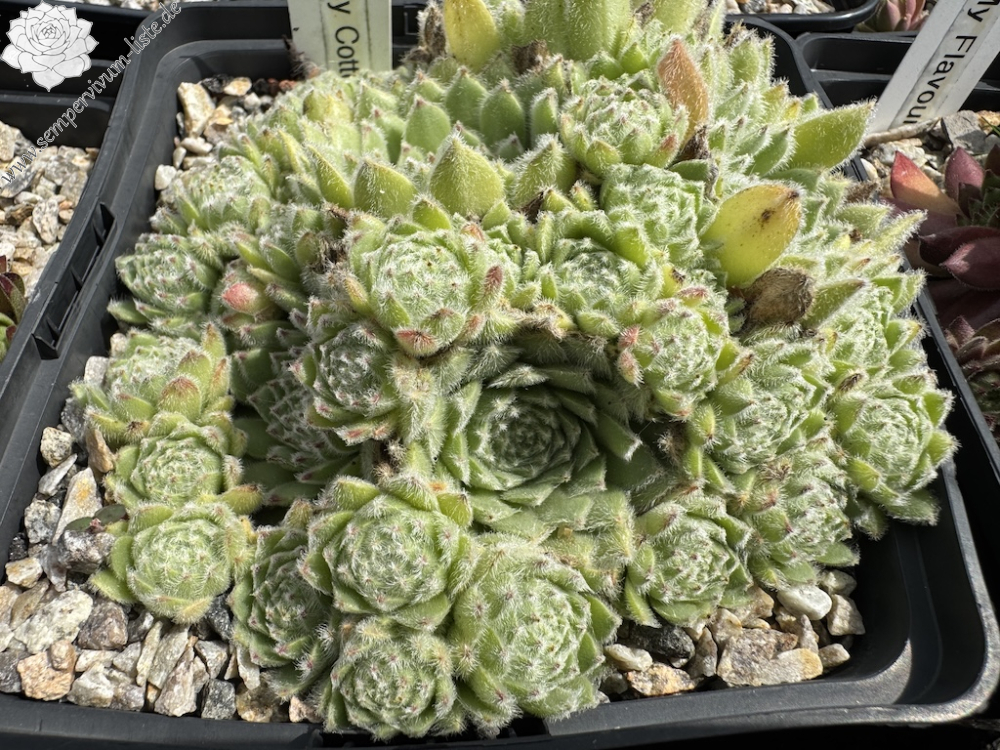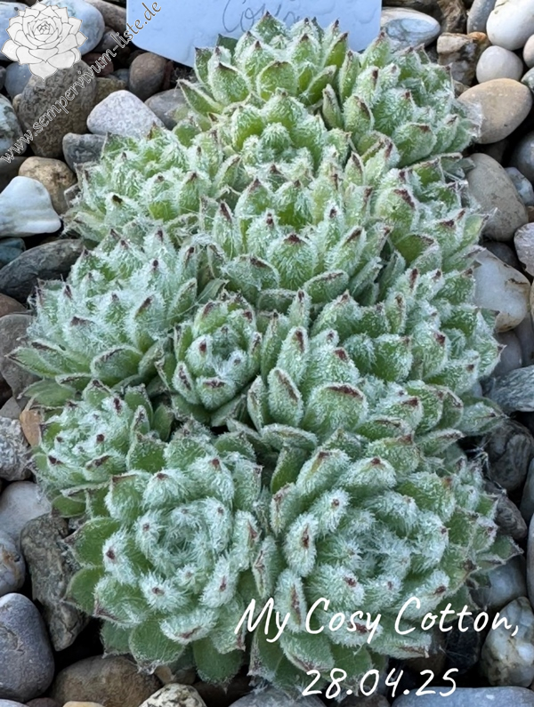 Diese Sempervivum besticht durch einen ganzjährigen pastelligen Grünton. Durch ihre starke Behaarung fühlt sie sich superweich an; eben wie "cosy cotton" (kuschelige Baumwolle)