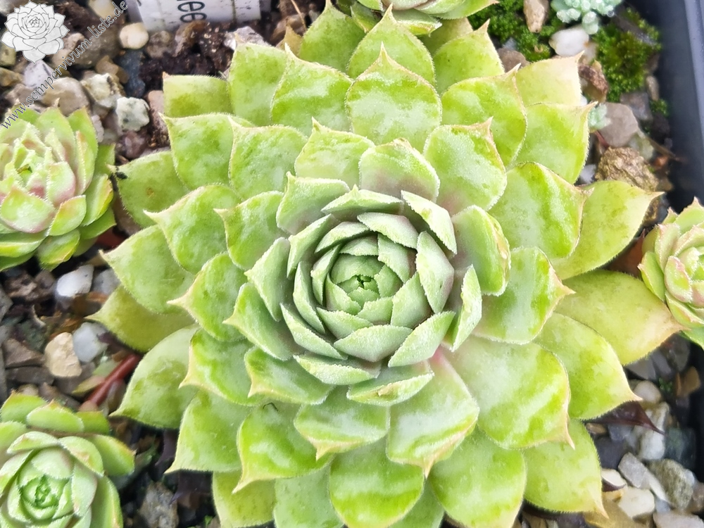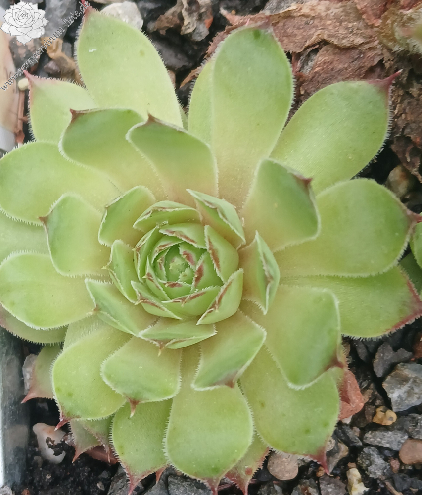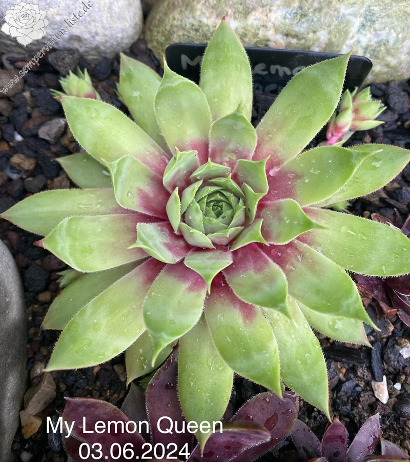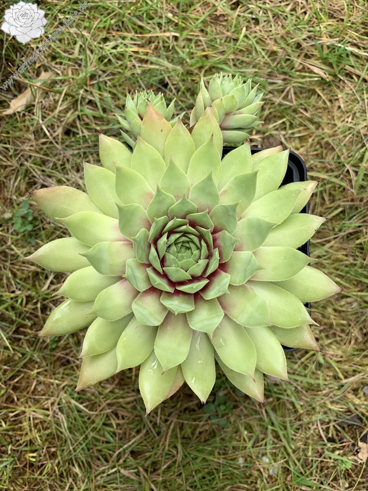 Mit Sempervivum 'My Lemon Queen' haben wir eine neue zitronengrüne Züchtung. Sie ist mir sofort zwischen den Sämlingen aufgefallen und hat im ersten Jahr auffallend stark gesprosst und sogar Cristat-Formen gebildet. In den Folgejahren zeigten sich weniger Sprosse und nur noch vereinzelt Cristat-Formen. Ich persönlich mag keine stark sprossenden Sorten. Aus meiner Sicht geht die Schönheit der einzelnen Rosetten verloren, durch die vielen Ableger. Die Pflanzen erreichen einen Durchmesser von 10cm und zeigen einen hellen zitronengrünen Farbton. Besonders auffallend wirken die roten Blattanfänge. Im Sommer färben sich die äußeren Blätter etwas rötlich. Eine schlichte Schönheit, mit wohl geformte Rosetten!