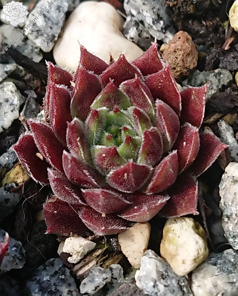 Vermutlich eine S. marmoreum ssp. erythraeum Hybride. Kleine, samtige Rosetten in Graugrün mit violetter Frühlingsfärbung.