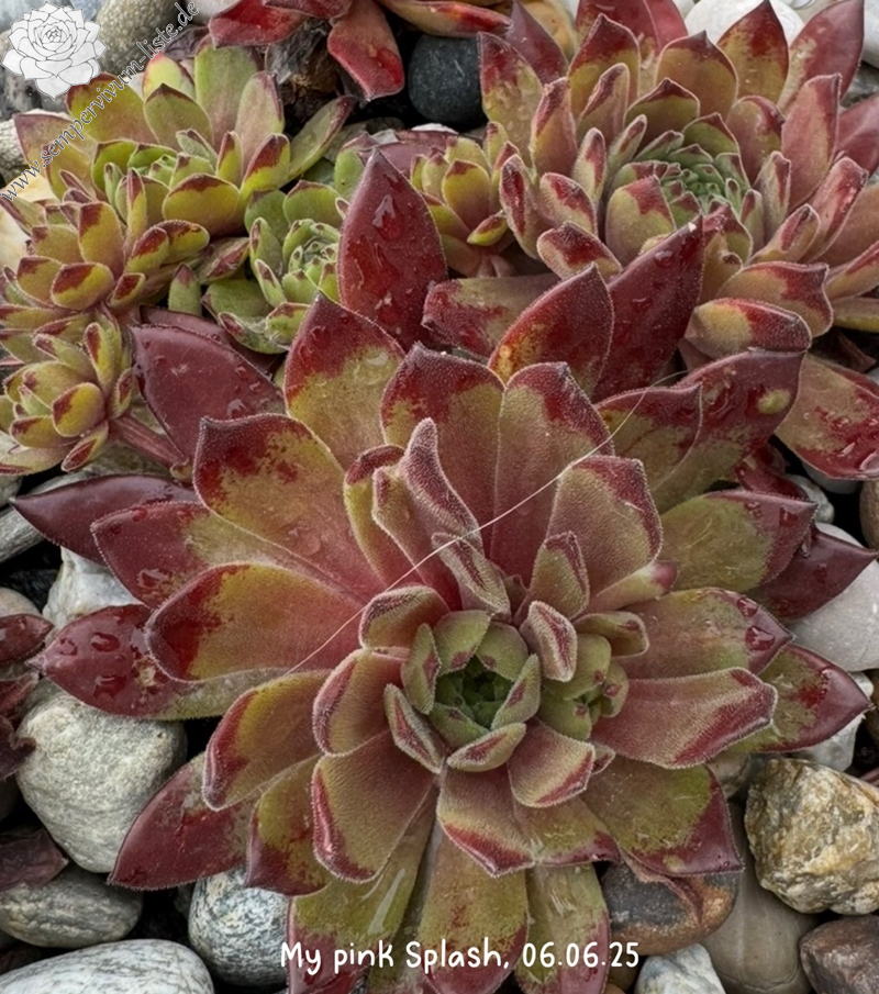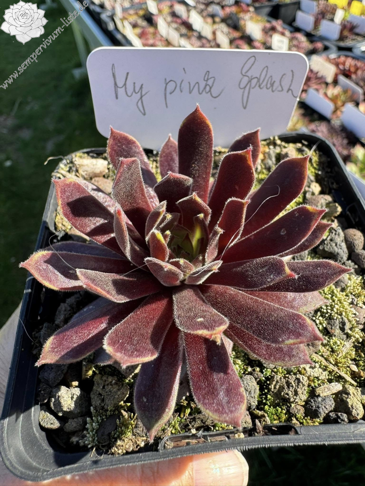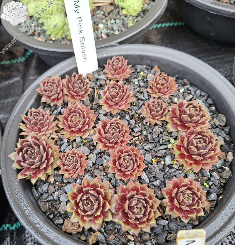 'My pink Splash' ist eine über das Jahr sehr bunte, samtige Sorte. Ende April entwickelt Sie ein besonderes Pink, welches sich in den Sommermonaten in den Blattspitzen absetzt. Die Sorte kindelt mäßig. Den Namen erhielt die Sempervivum durch ihre Farbe und Blattform, welche wie ein wie Wasserplatscher aussieht. Das Gemälde „A Bigger Splash“ von David Hockney trug zusätzlich zur Inspiration bei. Wie alle anderen Züchtungen ist sie winterhart und sehr robust.