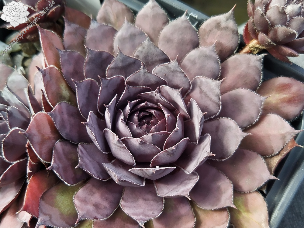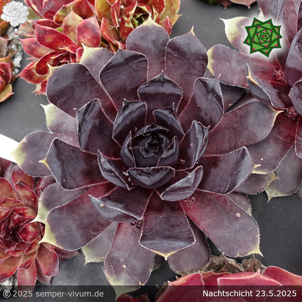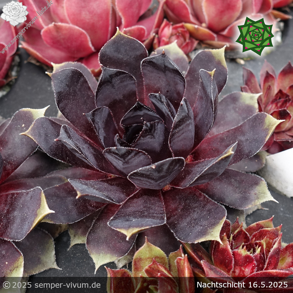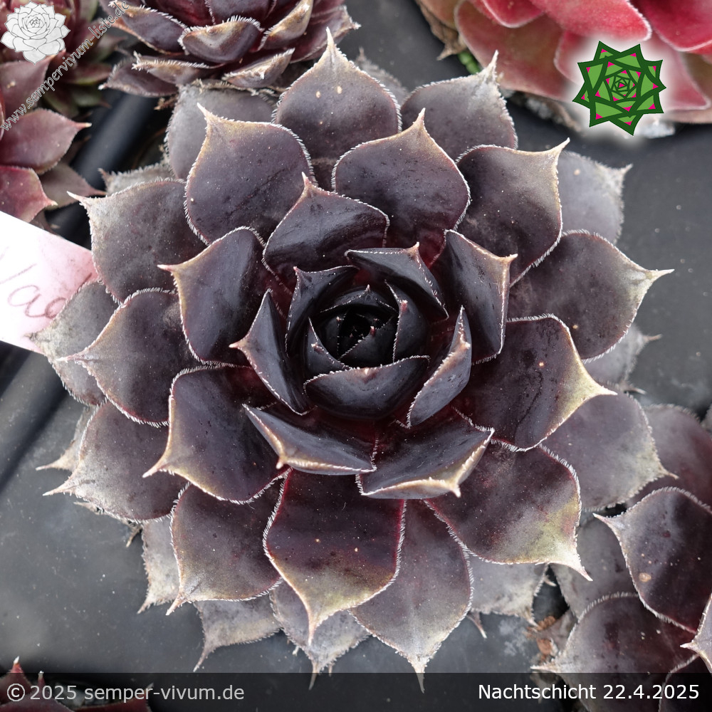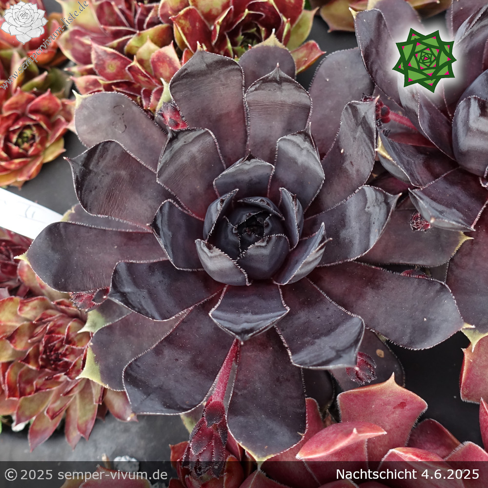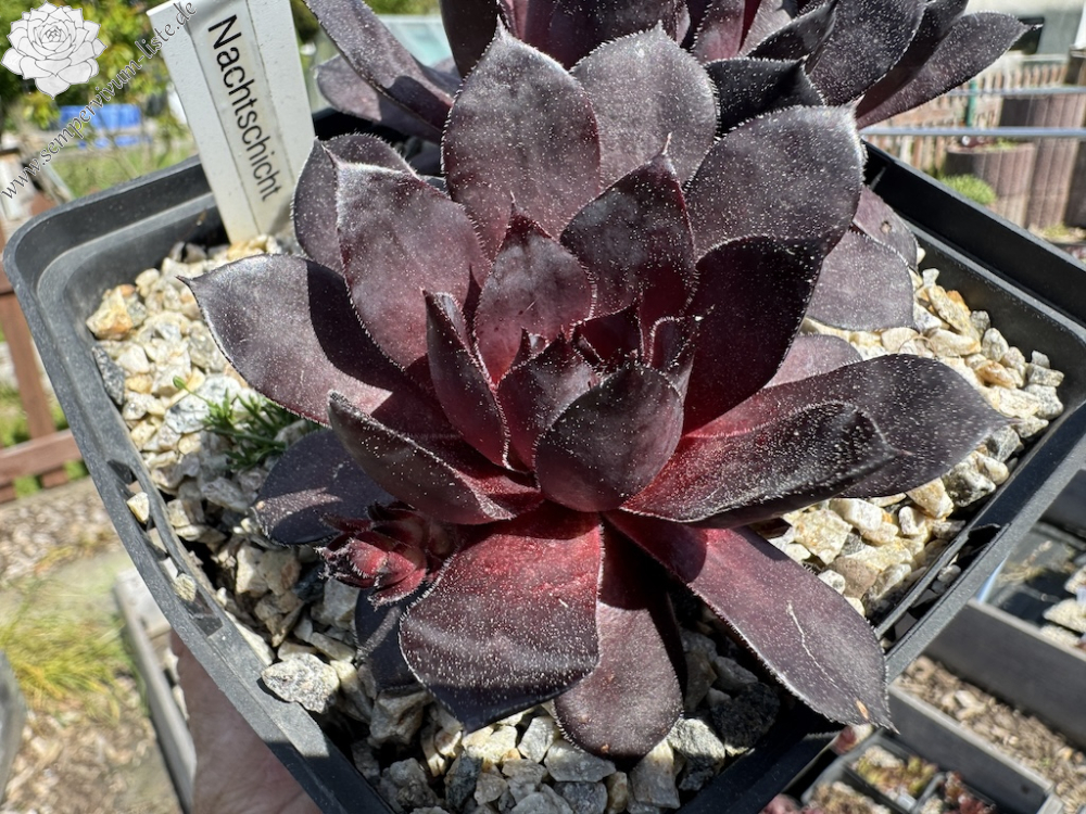 Das ist eine grandiose Neuheit mit großen Rosetten in einmaliger Färbung. Das Sensationelle ist die schwarze Färbung, die während des ganzen Jahres zu sehen ist. Es gibt bereits viele Sorten in dunkler Färbung mit purpurroten Farbpigmenten, deren Anteil bei 'Nachtschicht' deutlich geringer ist. Für uns die bislang dunkelste Sorte, die wir kennen. Eine wahre Kostbarkeit unter den vielen neuen Züchtungen, die jedes Jahr auf den Markt kommen!