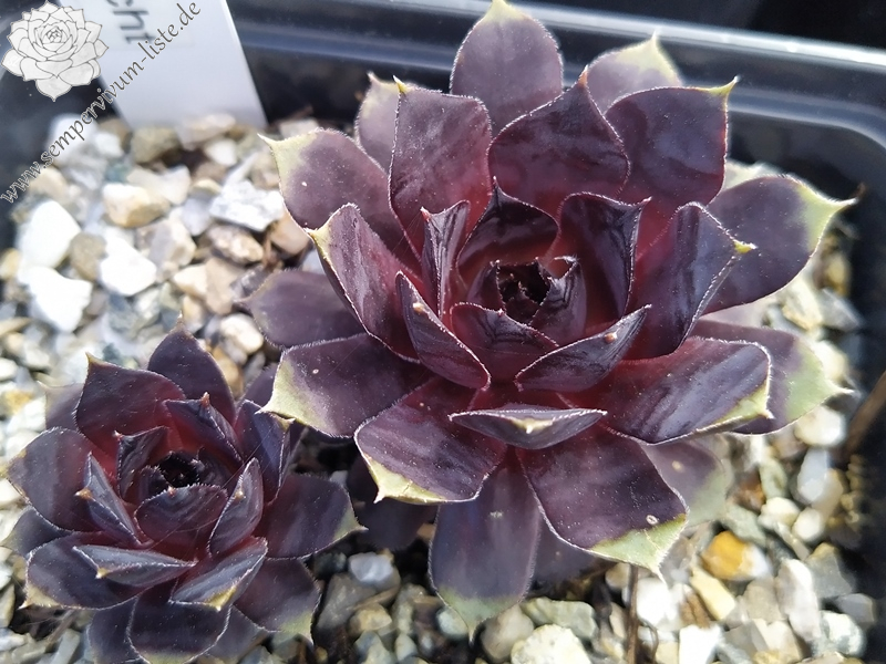 'Nachtschicht', Aussaat 2017 aus einer "roten Typen" Samen- Mischung von Samen aus meiner Sammlung. Bis April 2019 stand er dann in der Multitopfplatte als er mir dort das erste mal richtig mit seiner "schwarzroten" Farbe auffiel. 'Nachtschicht' ist bis in den Mai hinein nahezu schwarz und fällt in der Sammlung sofort auf. Im Juni färben sich dann die äußeren Blattreihen ins weinrot, die inneren Blätter haben einen grau-schwarz-blauen Stich. Im Juli geht das heller werden weiter, es kommen altrosa Töne gemischt mit weinroten Tönen hinzu. Ab August ist der Höhepunkt erreicht, die altrosa Töne dominieren jetzt. Im September beginnt dann schon wieder das einschwärzen und die Rosetten werden wieder dunkel. Mir gefallen zudem die weißen feinen Zähne an den Blatträndern und die dunklen Blattenden. Auffällig sind diese besonders an den Kindeln. Den ganzen Winter bis in den April hinein ist Nachtschicht' dann wieder auffällig schwarz. 'Nachtschicht' kindelt durchschnittlich, die Größe der Rosetten würde ich als mittelgroß verorten.