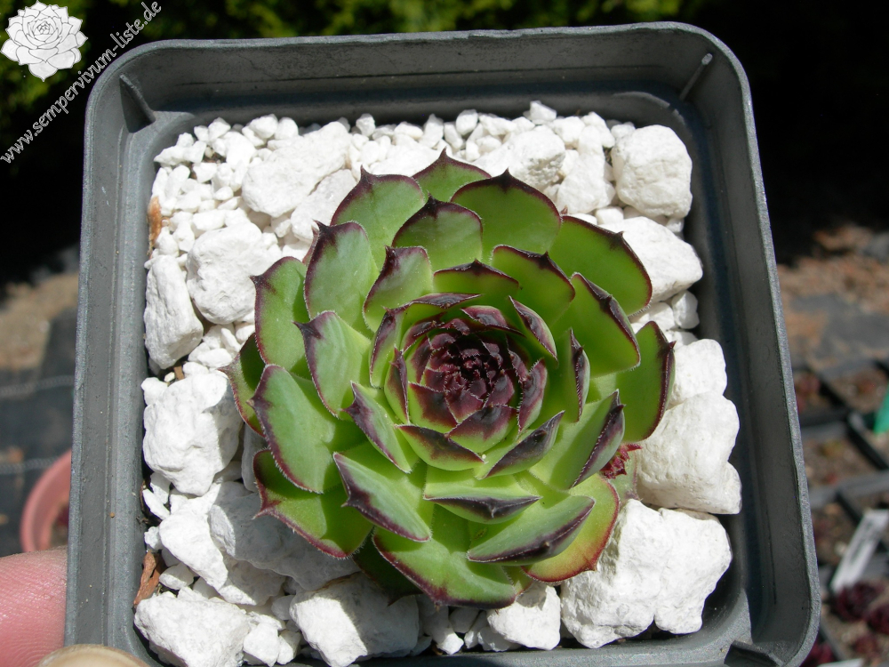 Średniej wielkości rozety 6-7cm w kolorze jasno zielonym, końce wskazówek (liści) mają brązowy rysunek. Liście szerokie, płaskie. Dobrze się mnoży.