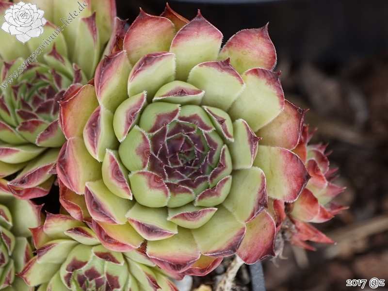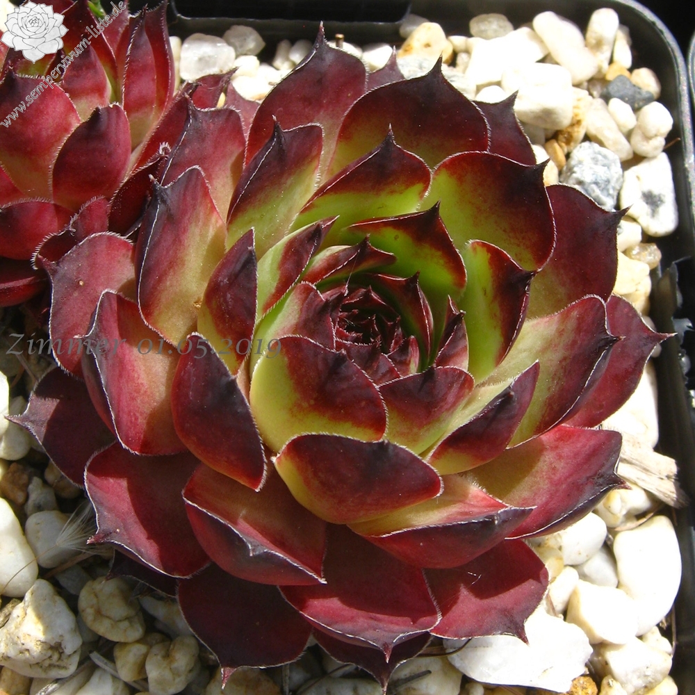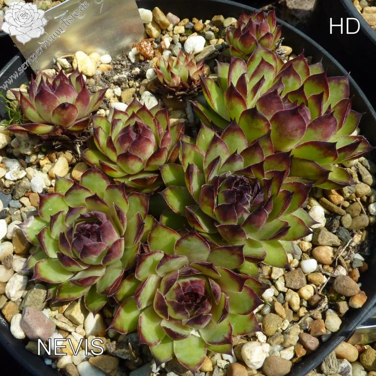 Sempervivum 'Nevis' ist eine ältere Dachwurz-Züchtung, die im Sommer mit ganz besonderen Farben für Aufsehen sorgt! Die Blattränder besitzen ein sehr dunkles Rot, das dann zum Zentrum hin immer heller wird. Ab der Hälfte der Blätter sehen wir dann ein sehr helles, kühles Grün. Ein wirklich toller Kontrast!
