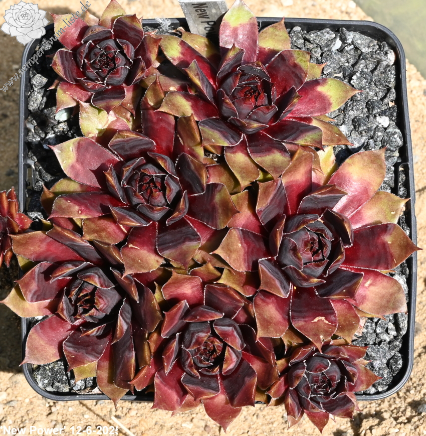 Mit Sempervivum 'New Power' haben wir eine ganz neue, sehr farbenfrohe Züchtung im Sortiment. Die kräftigen Rosetten erreichen einen Durchmesser von 9cm und haben sich als sehr robust gezeigt. Sie sprossen willig und bilden ganz dichte Polster. Besonders in den Sommermonaten fallen die Pflanzen auf. Die Färbung hält sich sehr gut und verträgt auch höhere Temperaturen. Das große, warm rotlila gefärbte Zentrum fällt sofort ins Auge. Die Blattenden besitzen eine helle Färbung und zeigen besonders im Sommer fast gelb/orange Töne. Zu dieser Zeit färben sich die Blattspitzen hellrot und verstärken diese bunte Wirkung. Das Zentrum wirkt metallisch und hat seinen ganz eigenen Reiz.