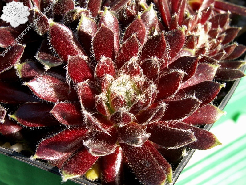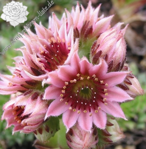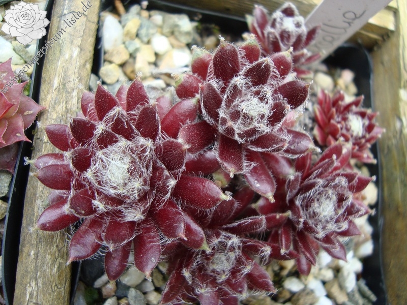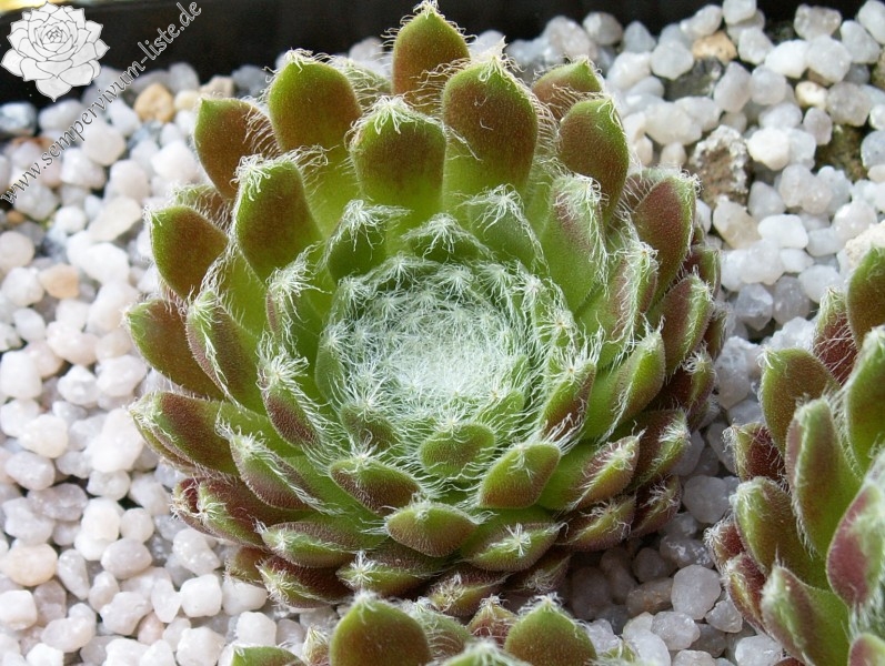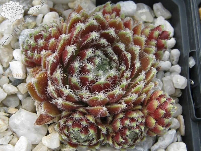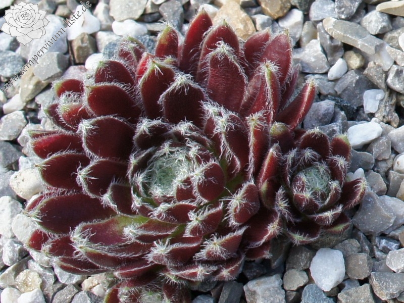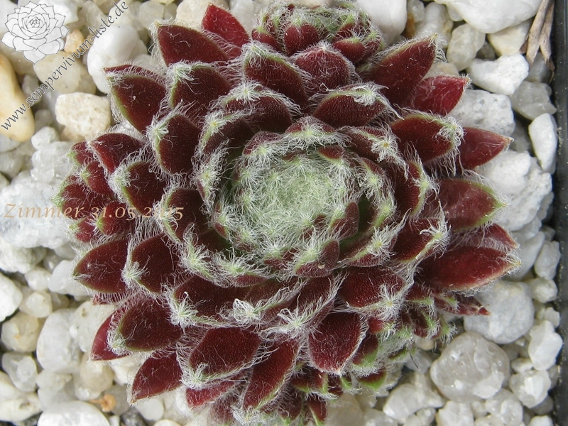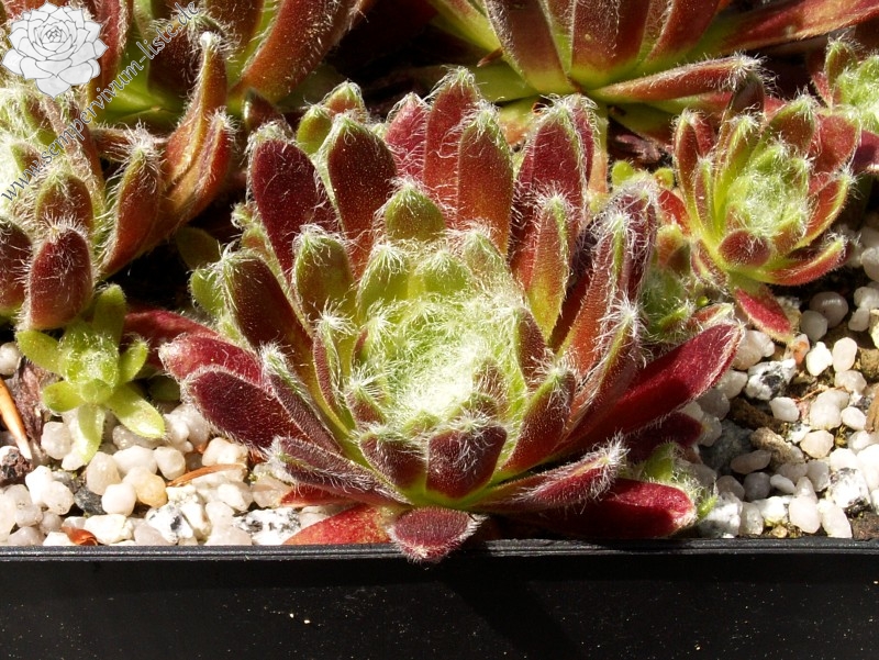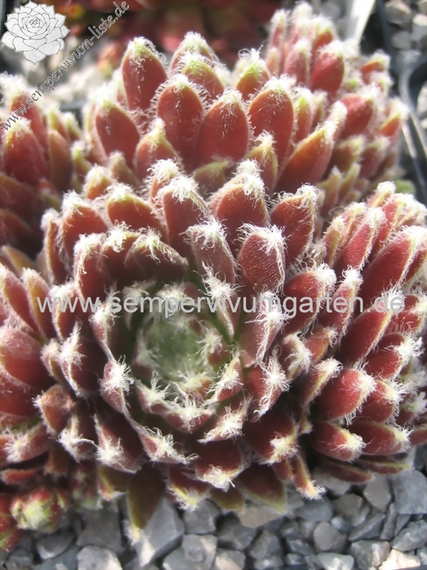 Eine größere Pflanze, die dichte rote Polster bildet. Die Blattspitzen sind stark bewollt.