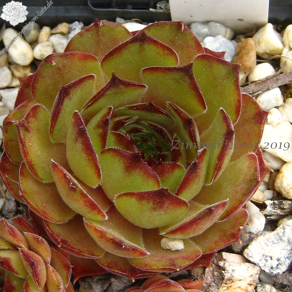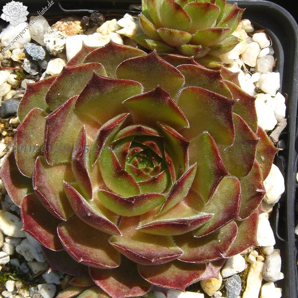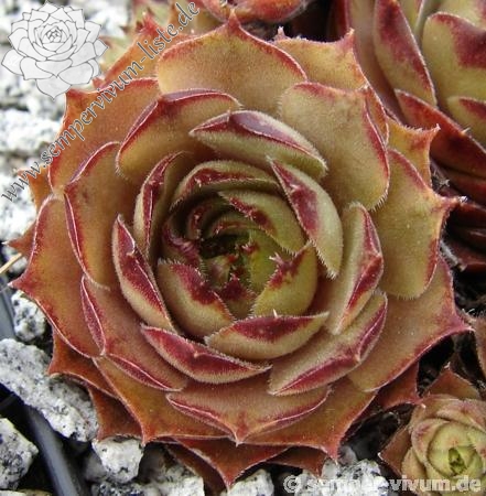 Die neue Sorte aus Belgien formt recht runde Rosetten in olivgrüner Grundtönung. Zum Frühjahr mischen sich orange und braune Töne unter. Dann zeigen die Spitzen der relativ breiten, leicht behaarten Blätter eine rotbraune Farbe.