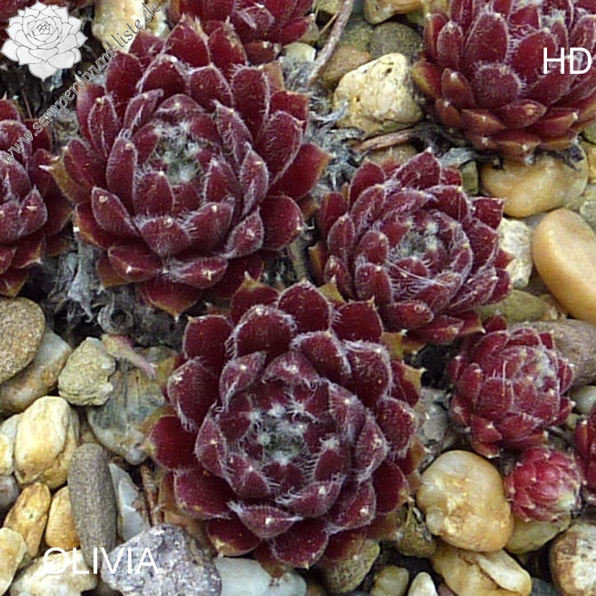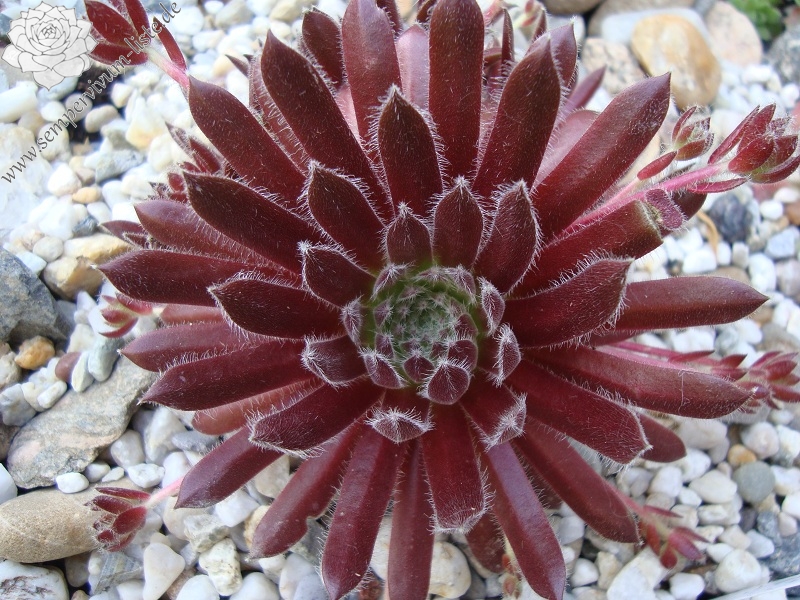 Bei der dieser Sorte mit dem selben Namen handelt es sich um eine S. arachnoideum Hybride aus den Niederlanden (?). Die leuchtenroten Rosetten formen weiße Tuffs an den Blattspitzen.