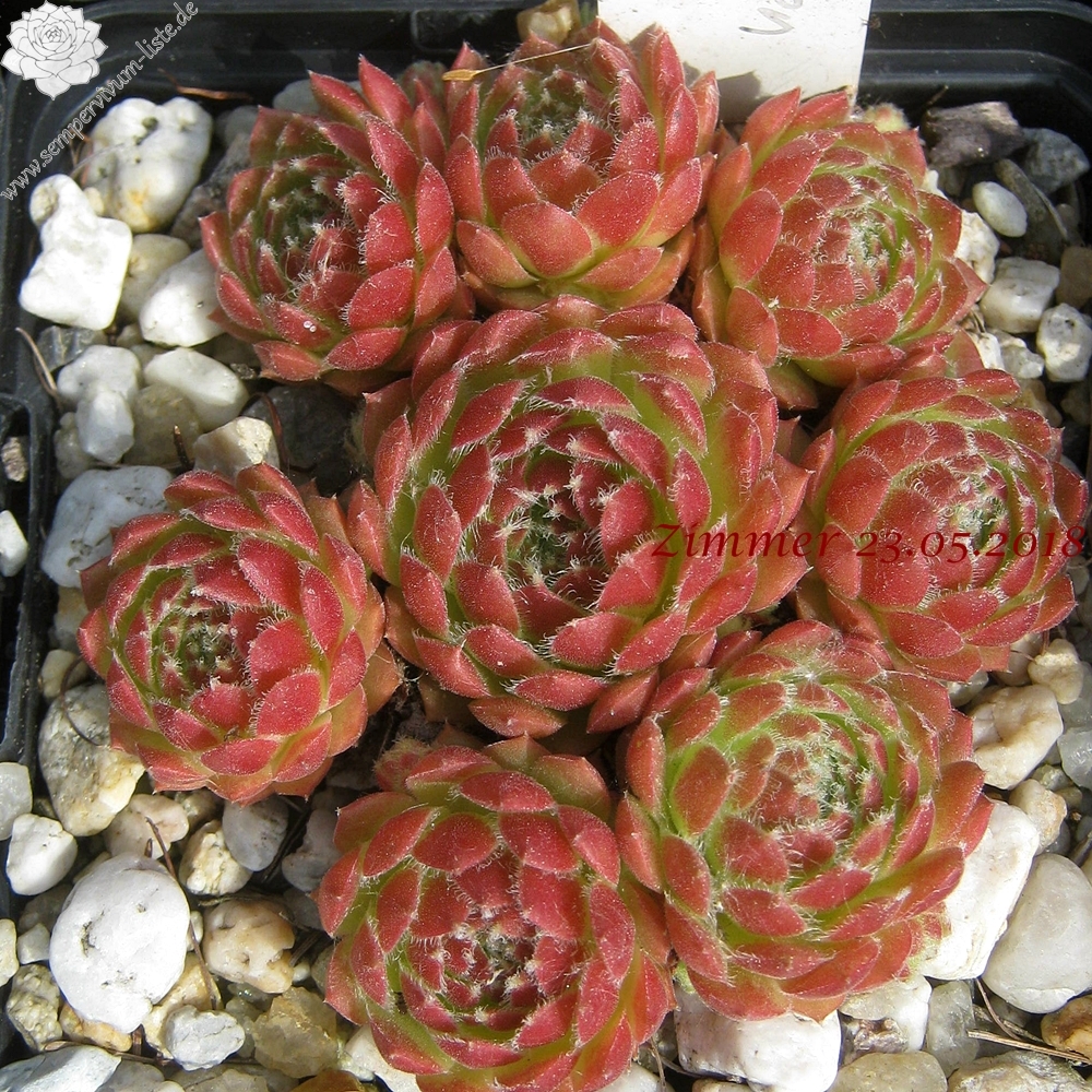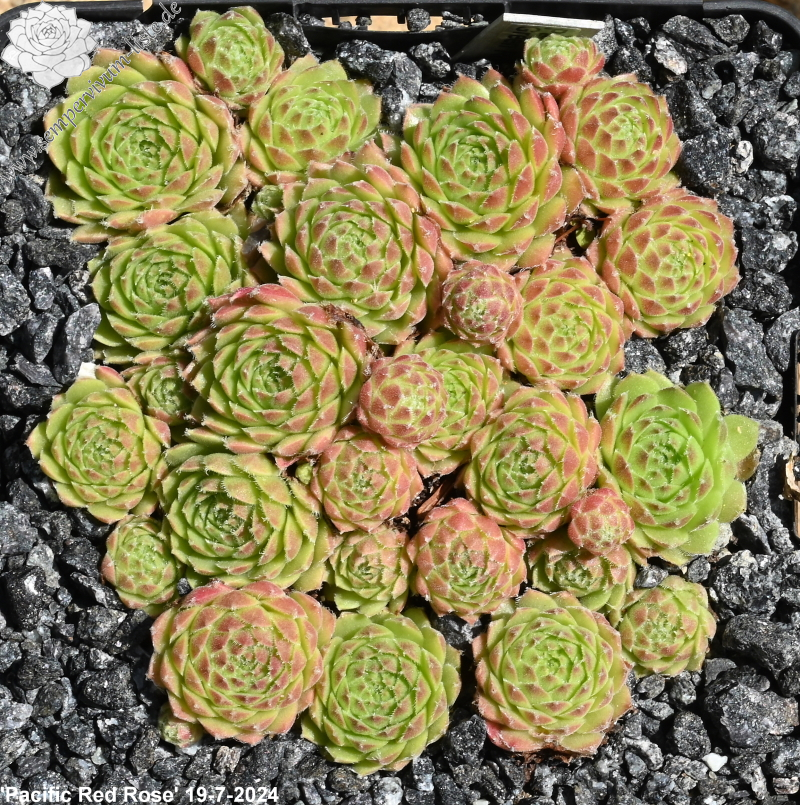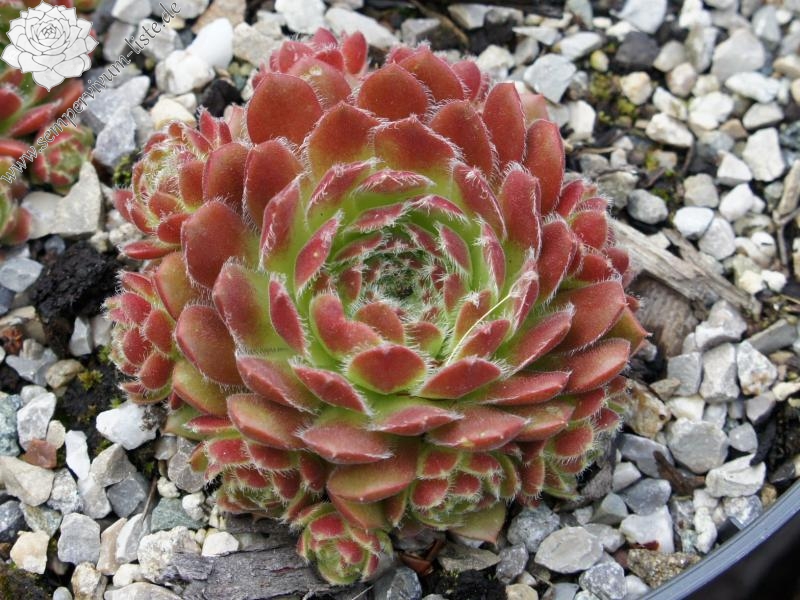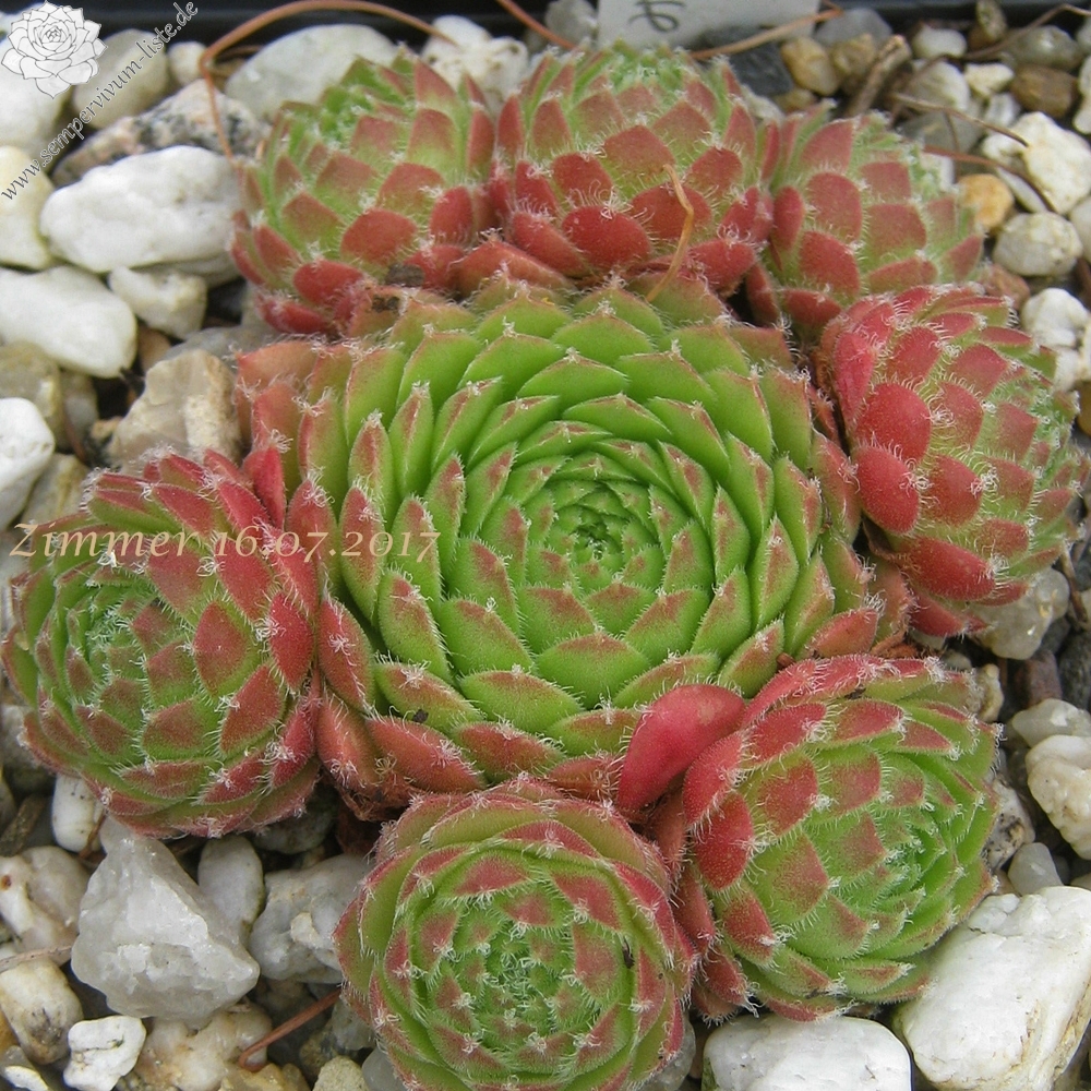Mittelgroße, apfelgrüne Rosetten mit pfirsichfarbener Frühlingsfärbung. Die Spitzen sind stark bewimpert.
