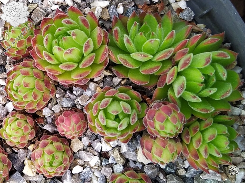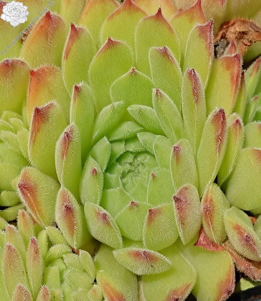 Die mittelgroßen, hellgrünen Rosetten zeigen schöne rötlich gefärbte Blattenden. Die Pflanzen sehen richtig samtig aus. Leider werden meist die grünen Sorten zu wenig beachtet.