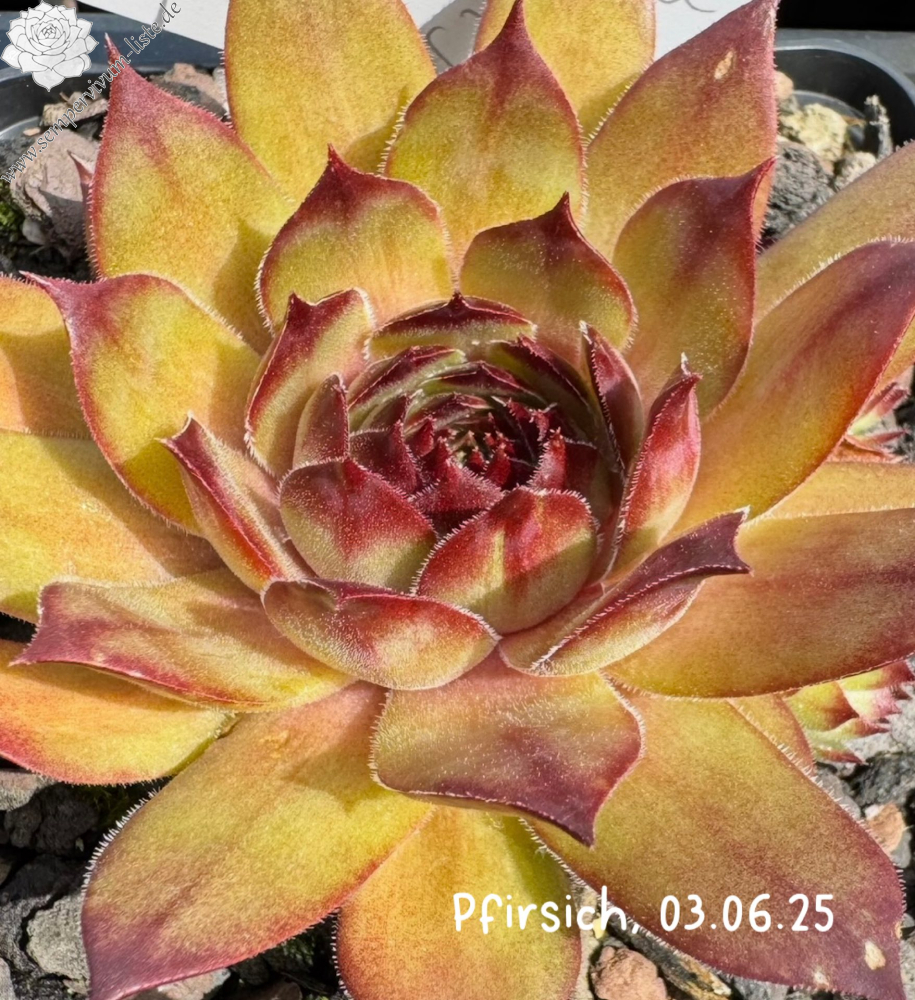 Mittelgroße Rosetten, behaart, mit einem Rand am Blattrand, erhalten im Sommer allmählich einen warmen pfirsichfarbenen Farbton. Die Eltern sind unbekannt.