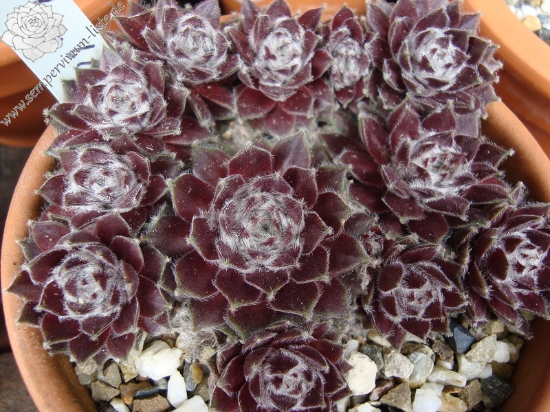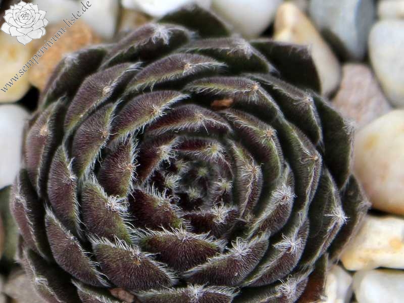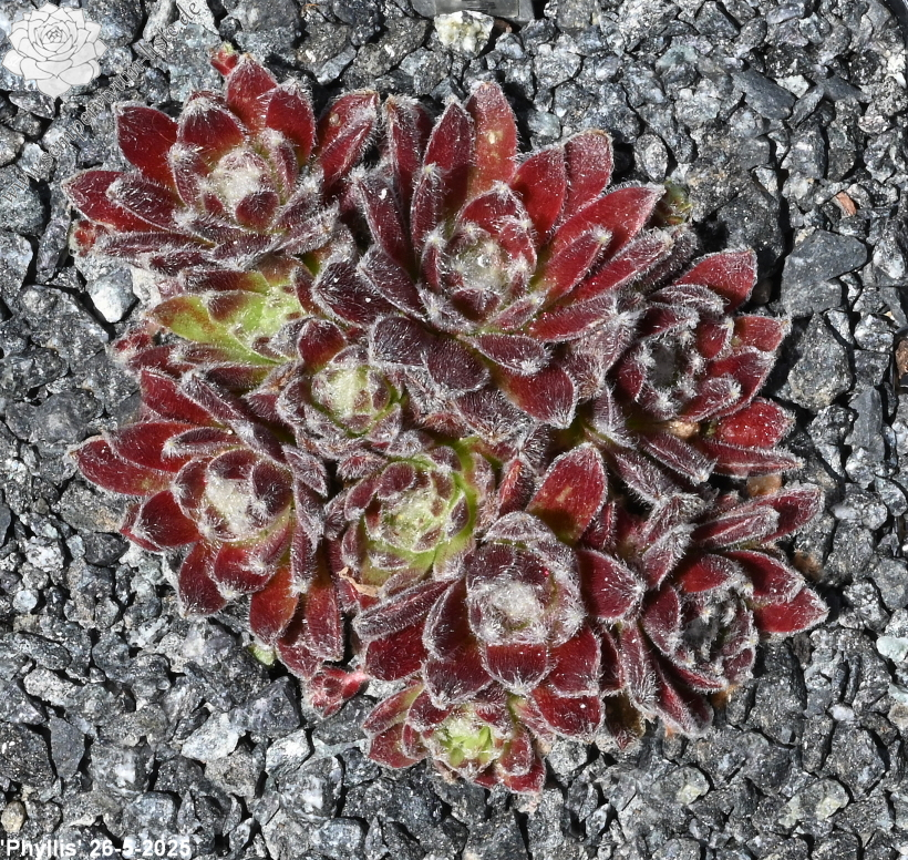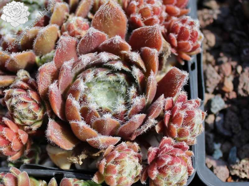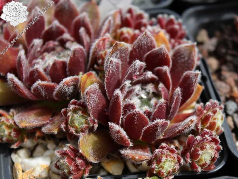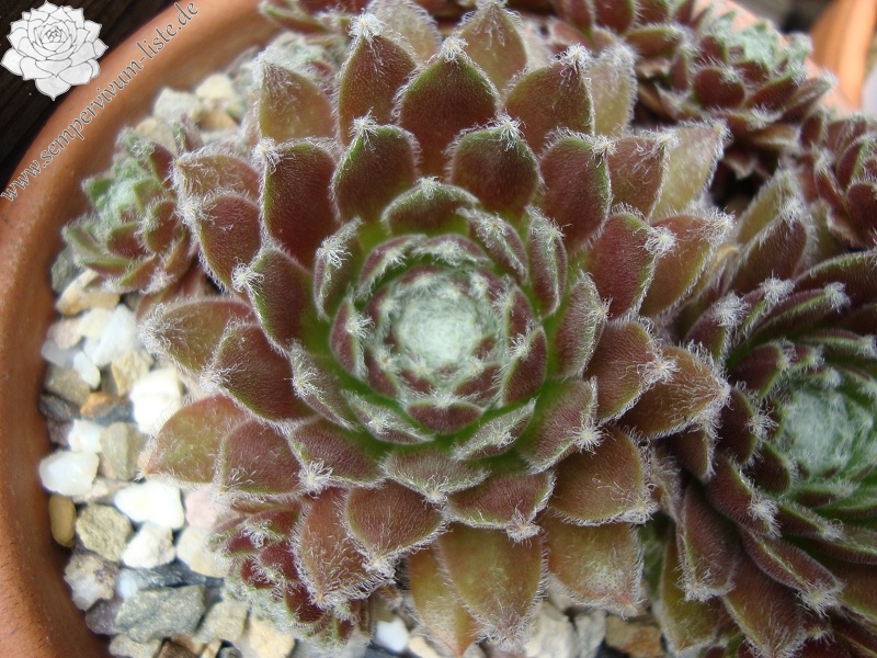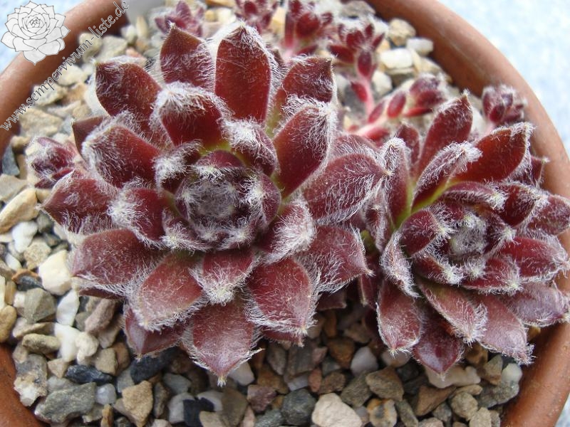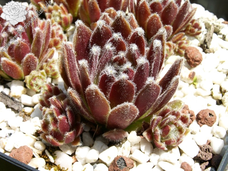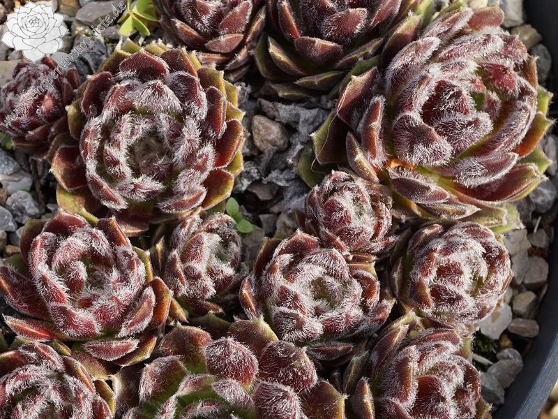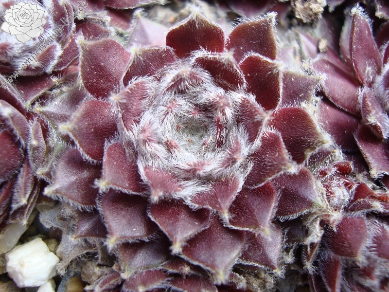 Rosetten bis 4 cm, samtige Substanz, Blätter linealisch, kurz bespitzt, blasslila - rotbraun, stark bewimpert, an den Blattspitzen kleine Haarbüschel