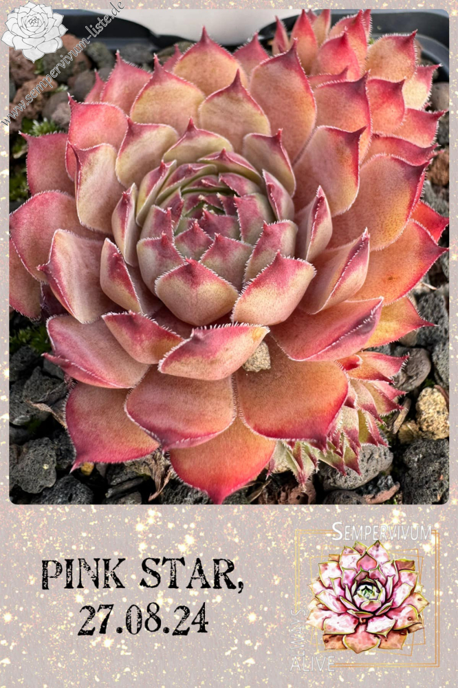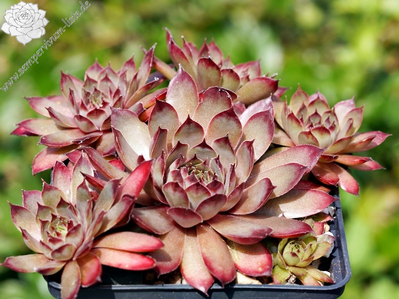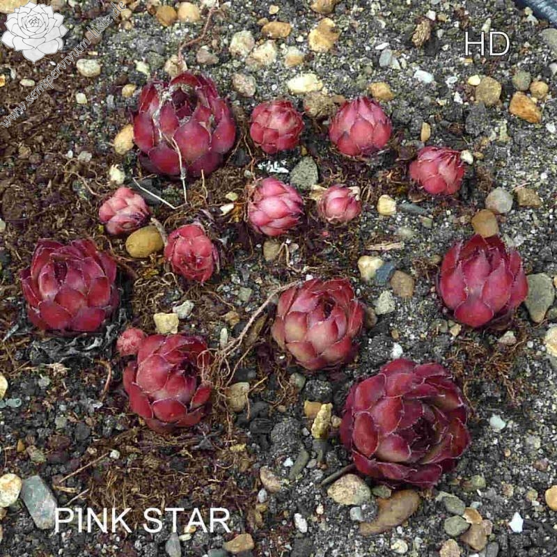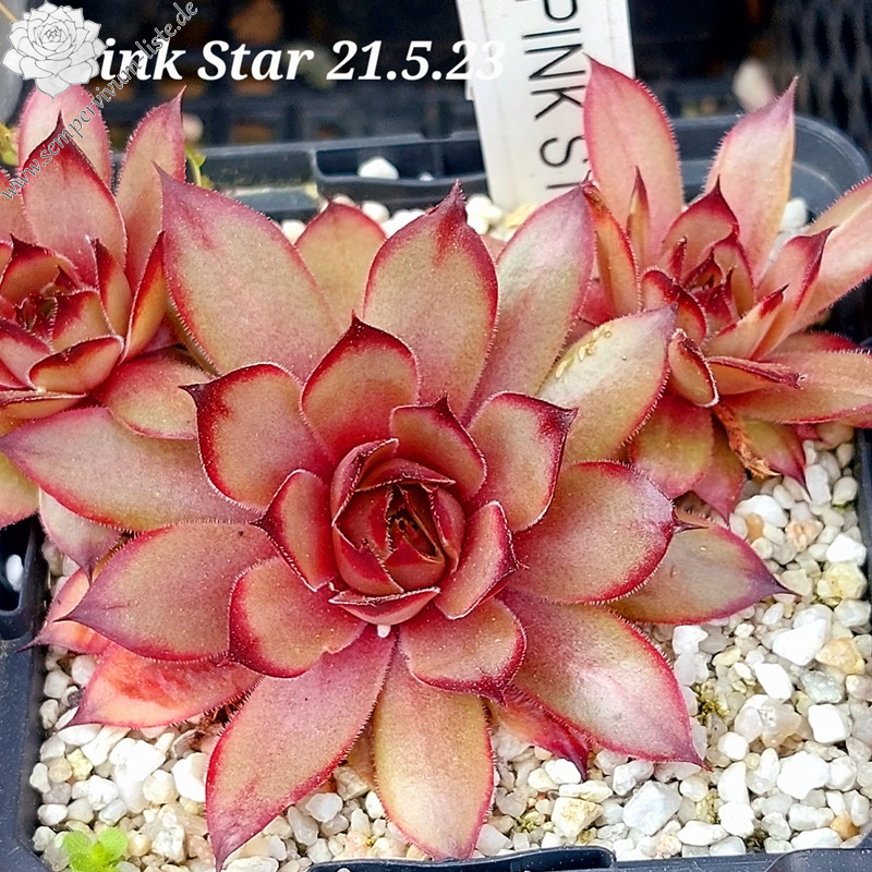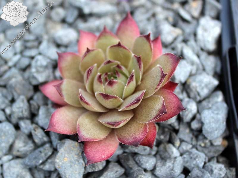 Rosetten bis 5 cm, Blätter rundlich, kurz bespitzt, blassrosa, Spitzen dunkelrot