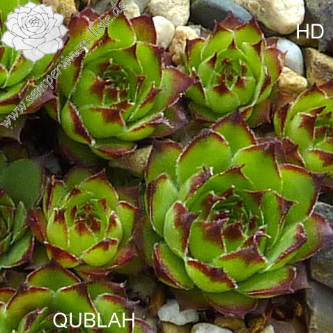 Sempervivum 'Qublah' ist eine neuere, sehr leuchtende Hauswurz-Züchtung. Die größeren, grünen Rosetten besitzen intensiv leuchtende Blattspitzen. Die breiten Blätter stehen fast senkrecht nach oben.