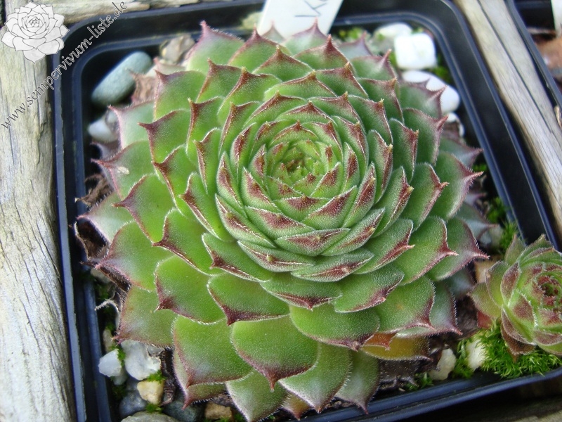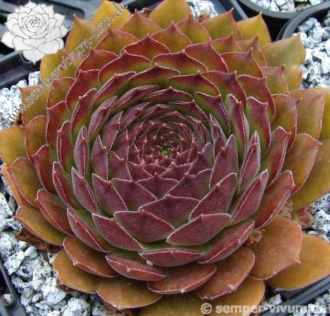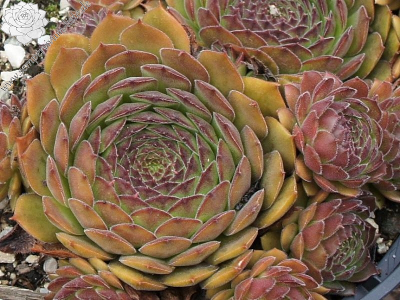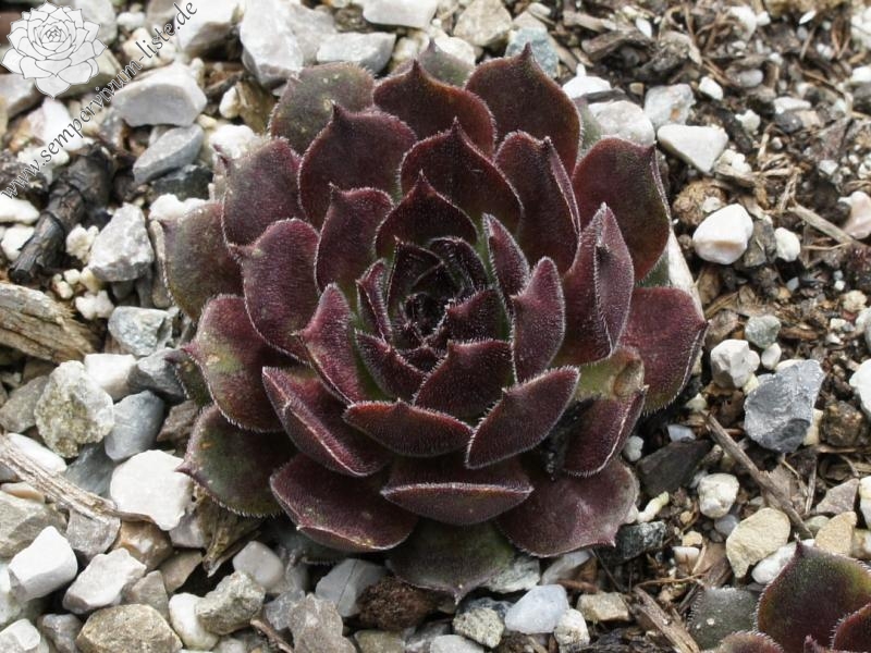 Eine relativ großrosettige Hybride aus Belgien mit purpurvioletter Frühlingsfärbung. Die Blattoberfläche ist samtig behaart, was den Rosetten im Sommer einen silbrigen Glanz verleiht. Zu dieser Zeit wechseln die Farben in terracottafarbenes Olivgrün mit bronzegetönten Blattspitzen.
