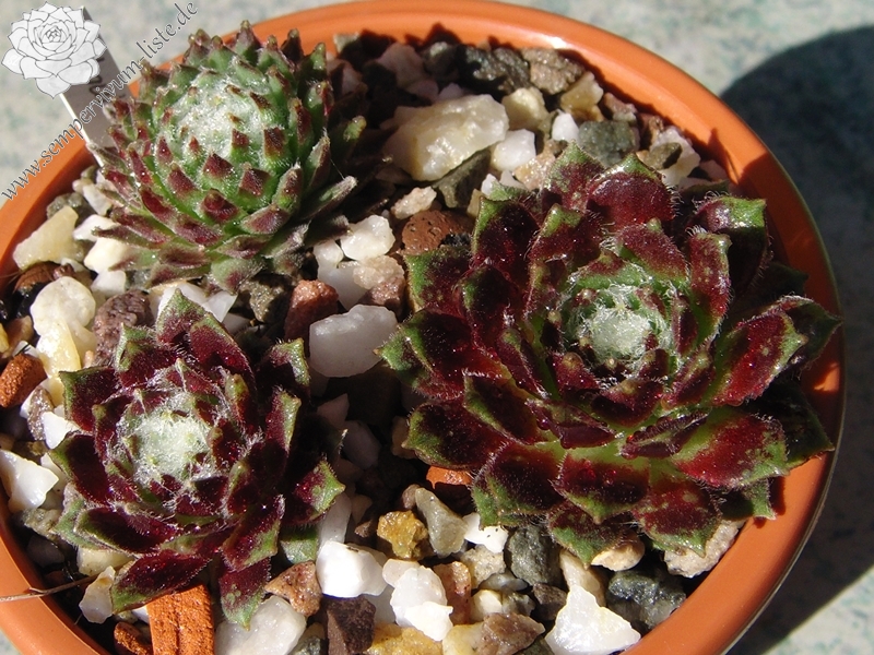 Dieser Spinnwebkultivar stammt vermutlich von Karl Foerster. Relativ offene Rosetten mit auffallend seerosenähnlich Form in Miniaturausgabe. Besonders die Blattspitzen sind putzig. Zum Frühjahr dunkelweinrote Färbung.