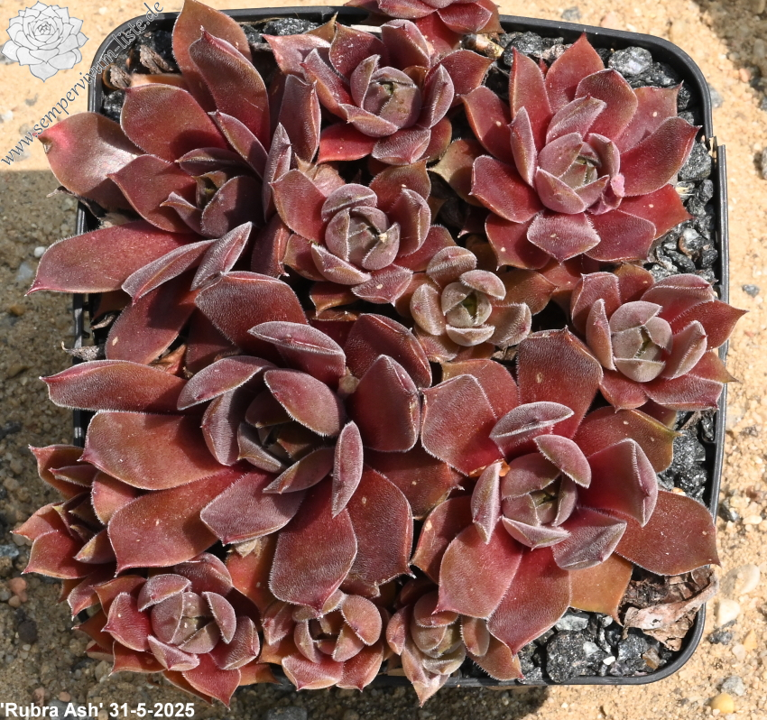 Die graupurpurnen, samtigen Rosetten sind fast identisch mit den Sorten 'Rotkopf' von Fritz Köhlein und 'Lynn's Choice'.