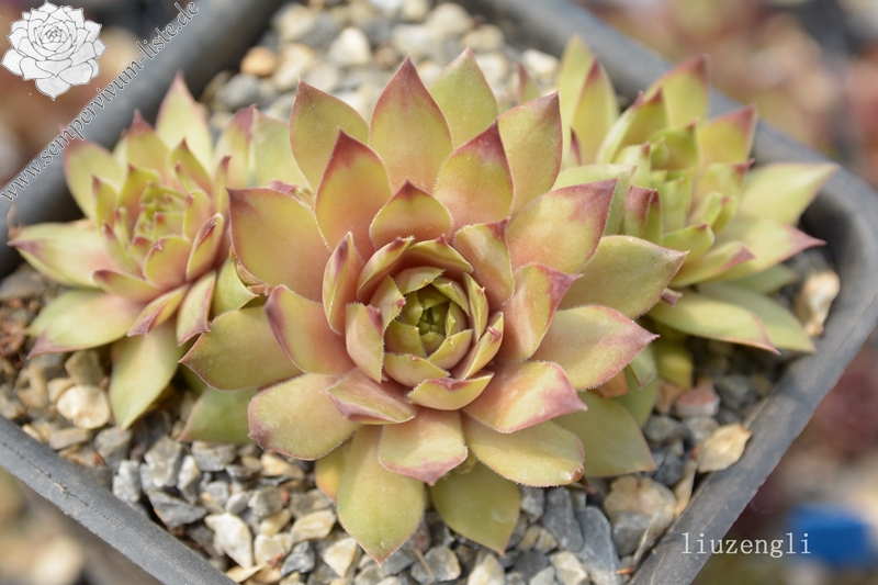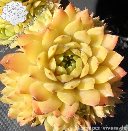 Dieser Sämling bereitet mir besonders viel Freude. Eine Sempervivum mit einer ziemlich ungewöhnlichen Farbe, dennoch sehr gefällig und gut verwendbar, um einer Pflanzung einen farbigen Spritzer zu verleihen. Die Grundfarbe ist ein helles Grün umgeben von dunklen Spitzen. Im Juni wechselt die Farbe in ein schönes Gelb mit kräftig rotorangen Blattspitzen. Diese Färbung hält den ganzen Sommer! Das leuchtend gelbe Zentrum mit den warmen rotorangen Blattenden bildet eine sehr warme Kombination und ist ein wahrer ‚Eyecatcher'. Dieser große Nachkomme von 'Zannalee', der einen Durchmesser von 10cm erreichen kann, zeigt nur beste Eigenschaften. Trotz des gelben Farbtons ist die Pflanze sehr wüchsig und sprosst stark. Eine Sorte für die sommerliche Hauptrolle in jeder Pflanzung.