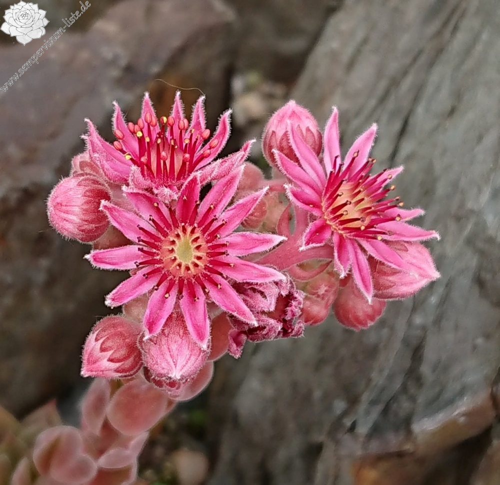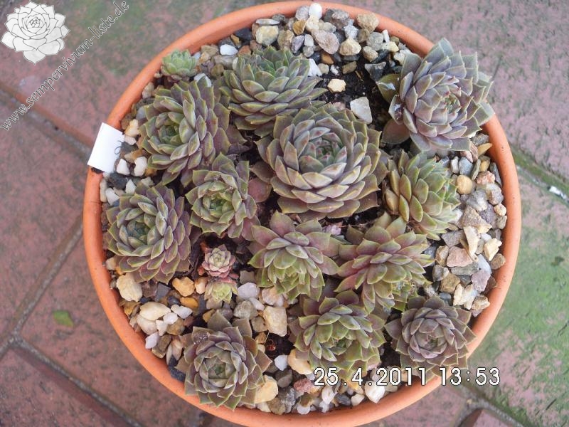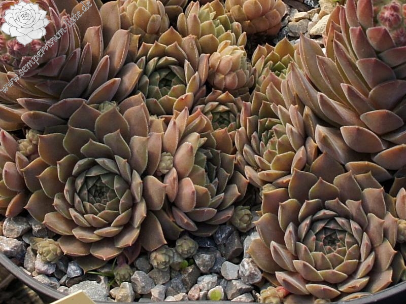 Eine neuere Hybride mit drei bis vier Zentimeter großen, violettgrauen, samtig überzogenen Rosetten. Es handelt sich um einen Sämling von der beliebten S. marmoreum ssp. erythraeum aus Bulgarien
