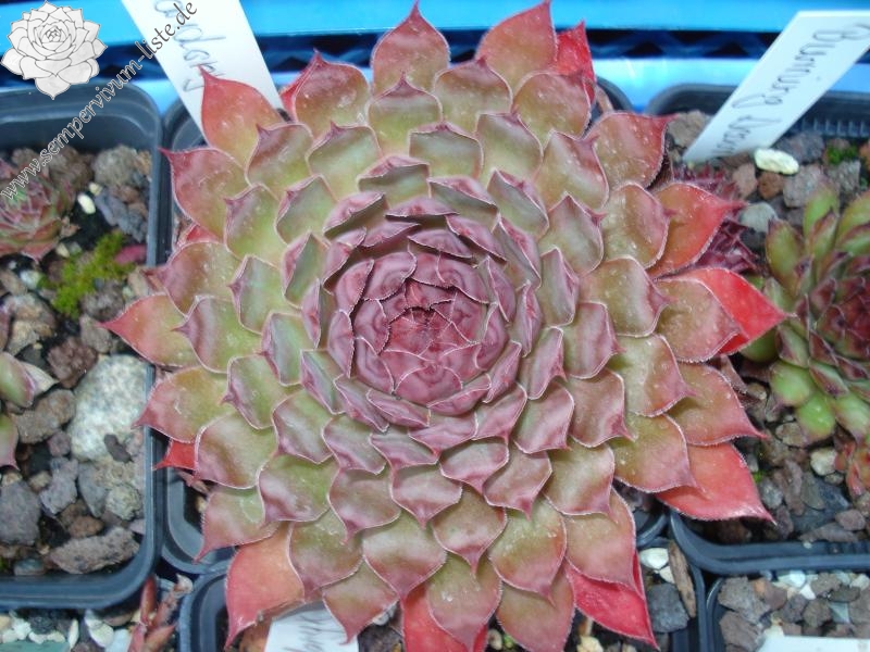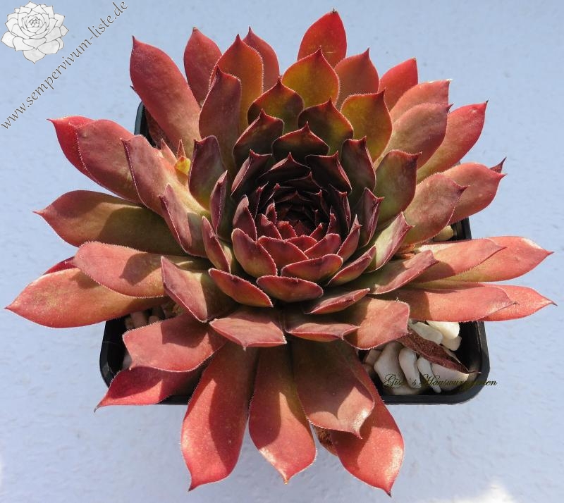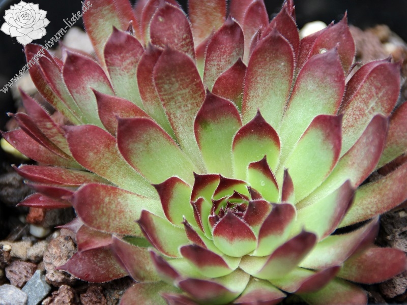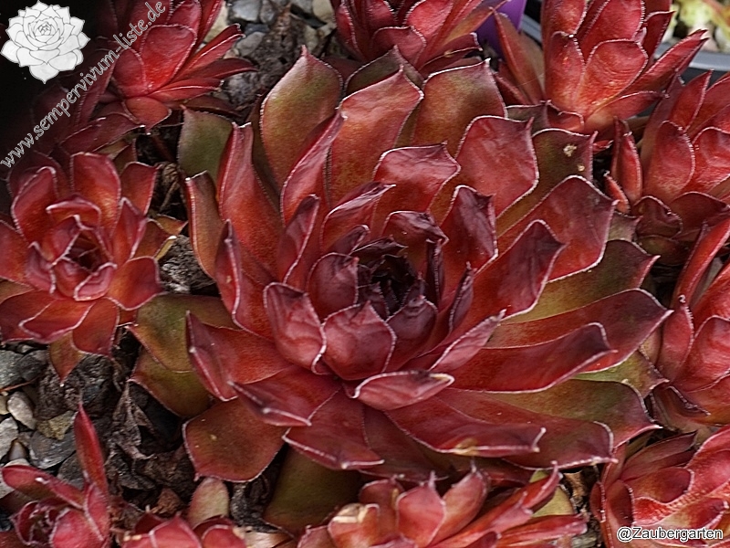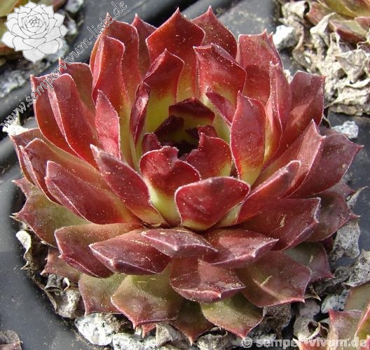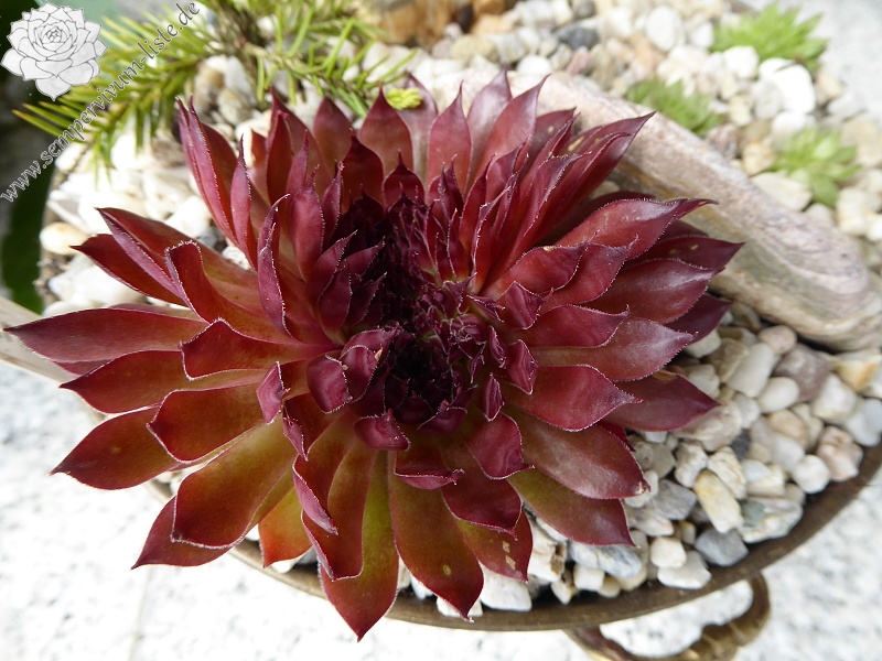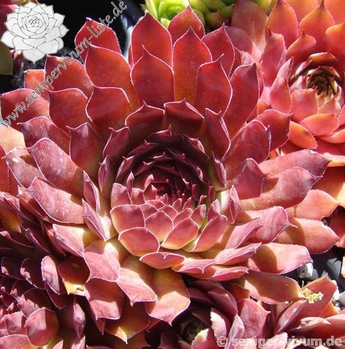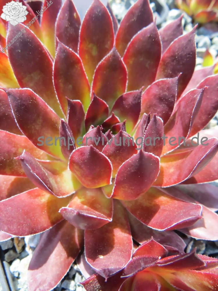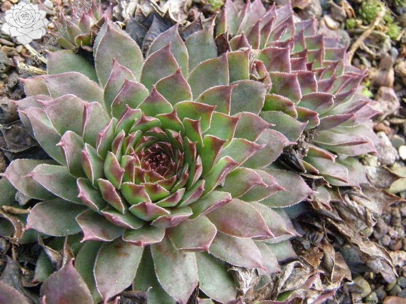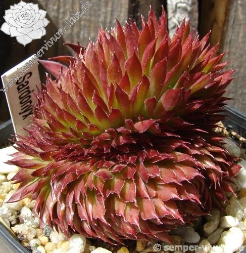 Sempervivum 'Sardonyx' ist eine größere Züchtung. Besonders im Frühjahr besitzen die Rosetten auffallend rötliche Farben. Im Sommer wird das Zentrum heller und zeigt schöne, grünliche Farben. Eine willig sprossende Pflanze.