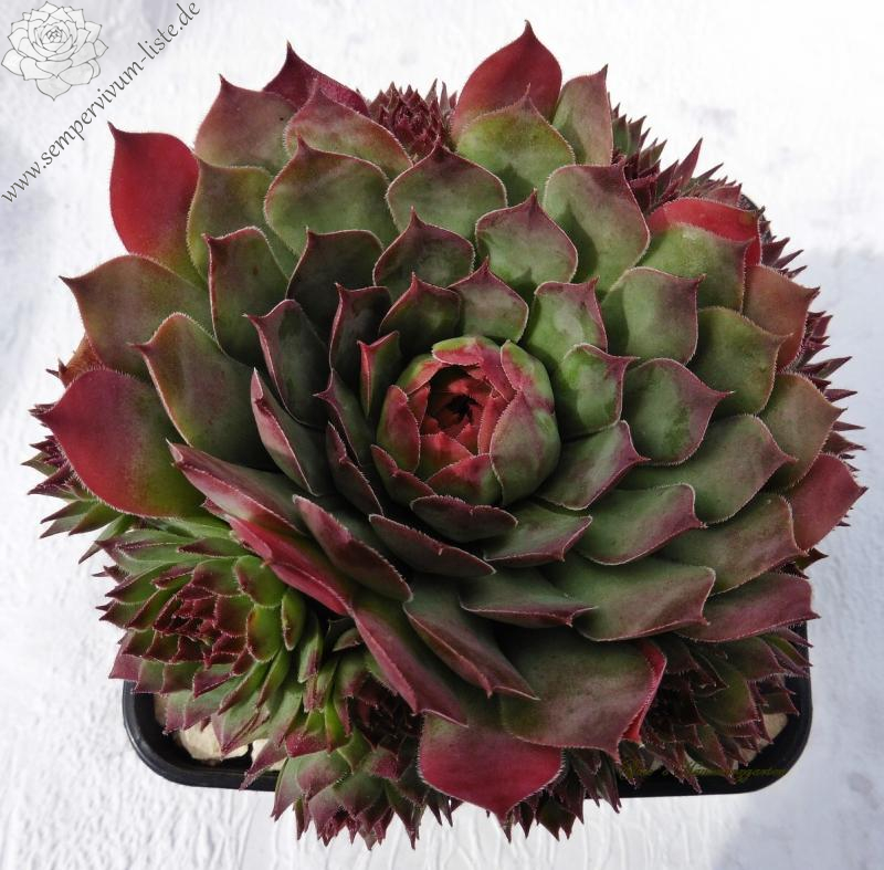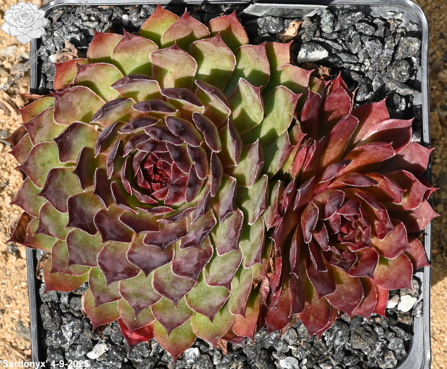 Sempervivum 'Sardonyx' ist eine größere Züchtung. Besonders im Frühjahr besitzen die Rosetten auffallend rötliche Farben. Im Sommer wird das Zentrum heller und zeigt schöne, grünliche Farben. Eine willig sprossende Pflanze.