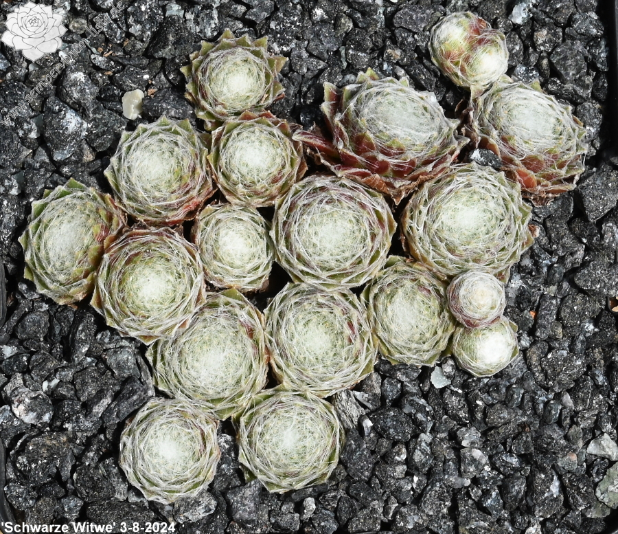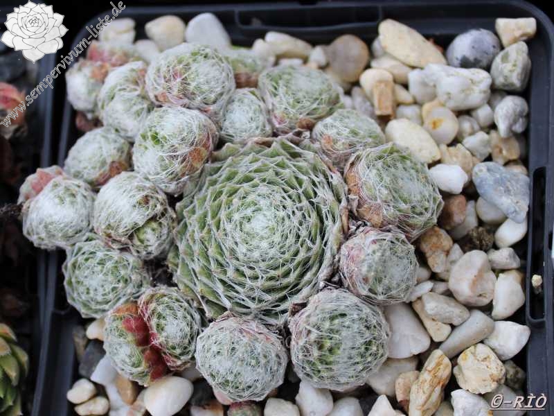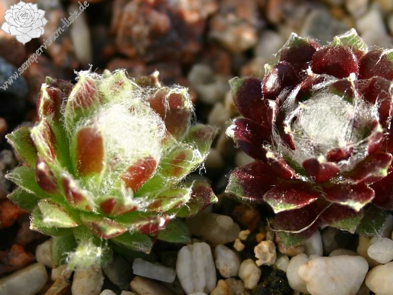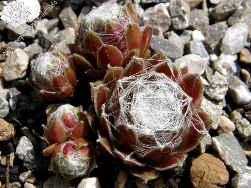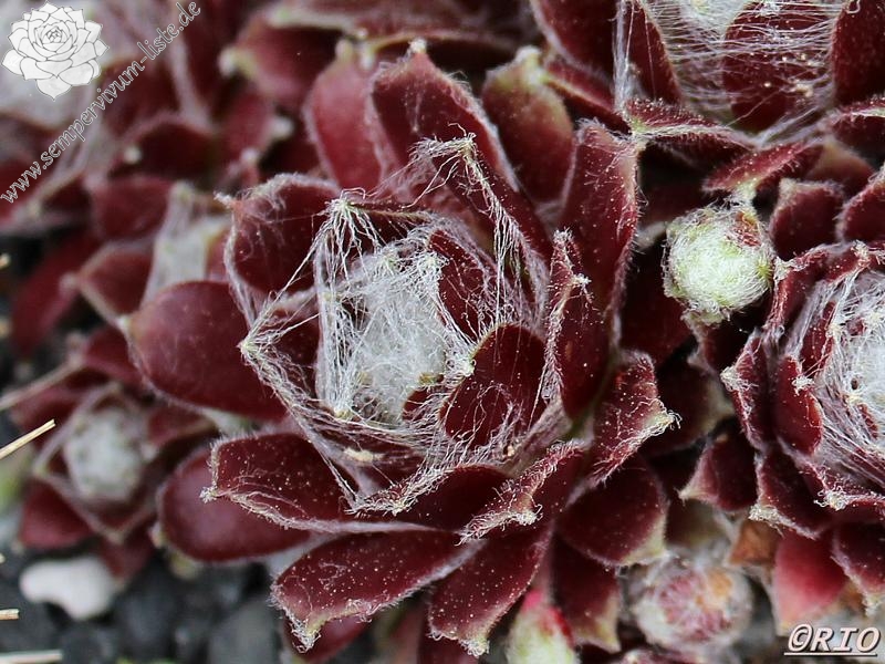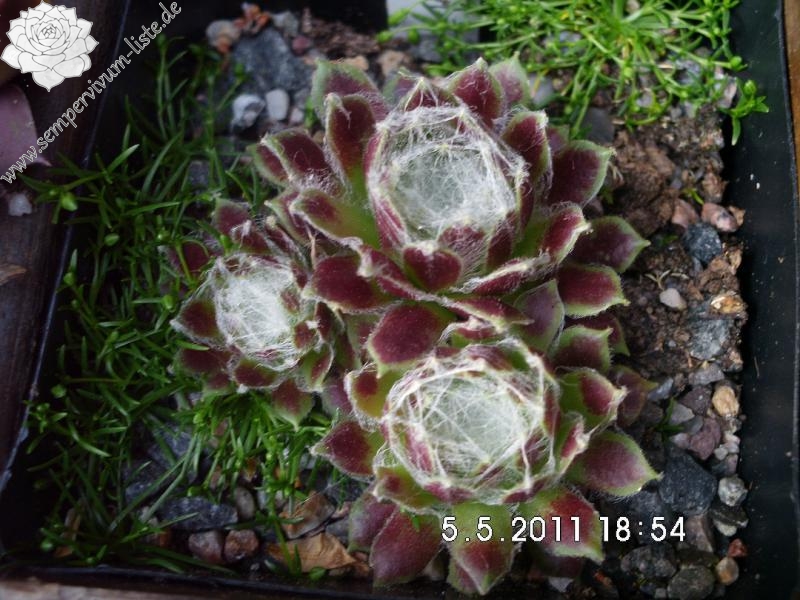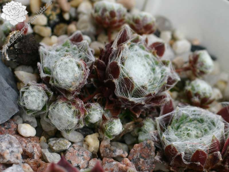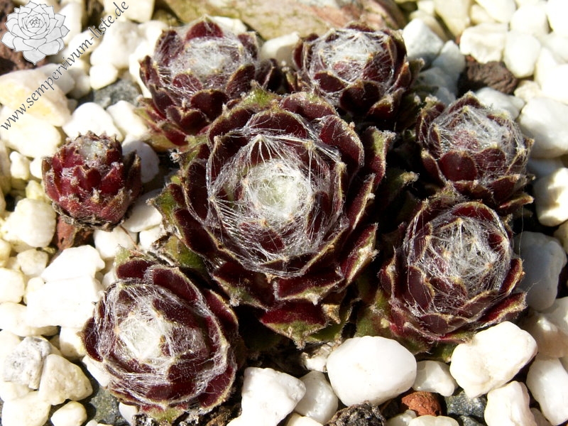 Die Herkunft dieser Spinnwebhauswurz ist unbekannt. Dunkel bordeauxviolette Rosetten, stark übersponnen.