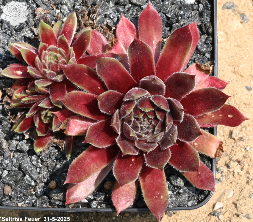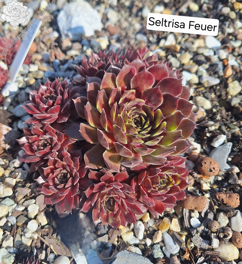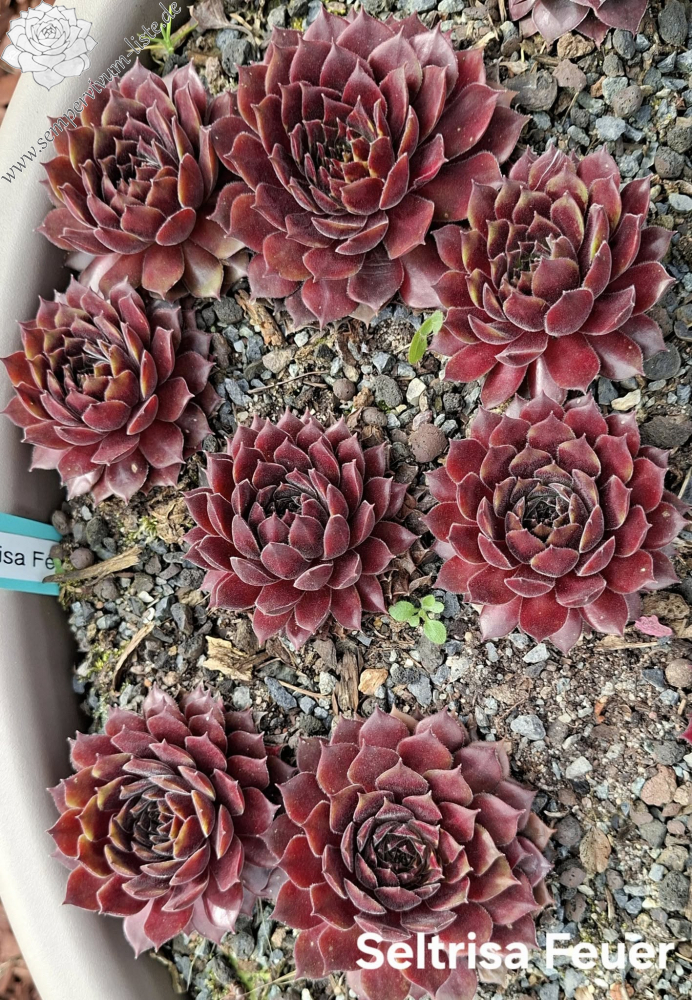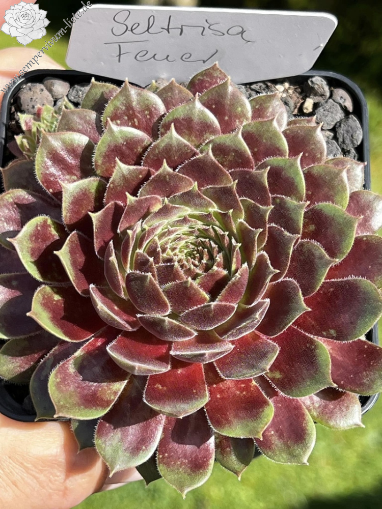 Seltrisa Feuer ist ein robuster Sämling, winterhart und nicht hitzeempfindlich. Im zeitigen Frühjahr sind die rotbraunen Rosetten sehr kompakt und samtig. Später bilden die Blätter hellgrüne Ränder aus, sie sind immer noch leicht samtig. Im Sommer werden die Blätter länger, die Rosetten werden offener und haben ein grünes Herz. Die äußeren Blattreihen glänzen feurig rot. In der größten Sommerhitze werden die Rosetten goldgelb, bis sie zum Herbst hin wieder mehr Farbe bekommen. Seltrisa Feuer hat eine besonders schöne Blüte. Die Petalen sind bordeauxrot und wirken am Ansatz noch dunkler. Weiter zur Spitze hin hellen sie fast zu rosa auf und haben eine golden gestrichelte Mitte.