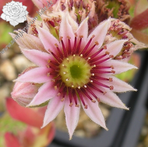 Original-Klon: Rosetten 8 bis 12 cm , hell braunrot, zur Mitte grün, bewimpert, rosa Spitzen.