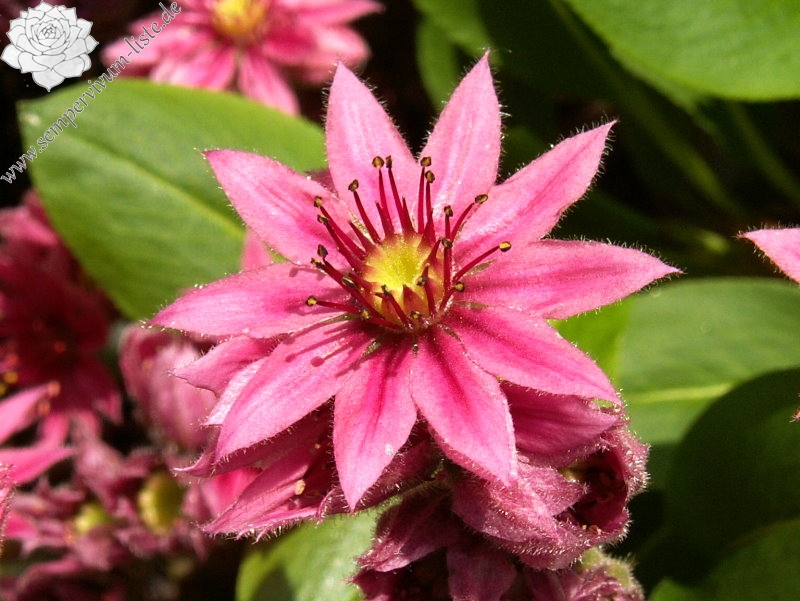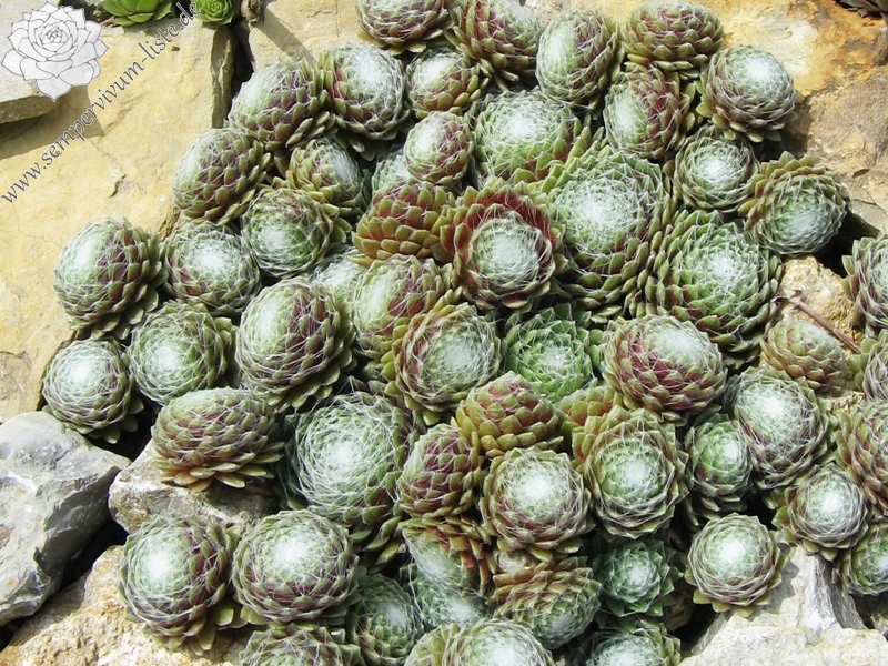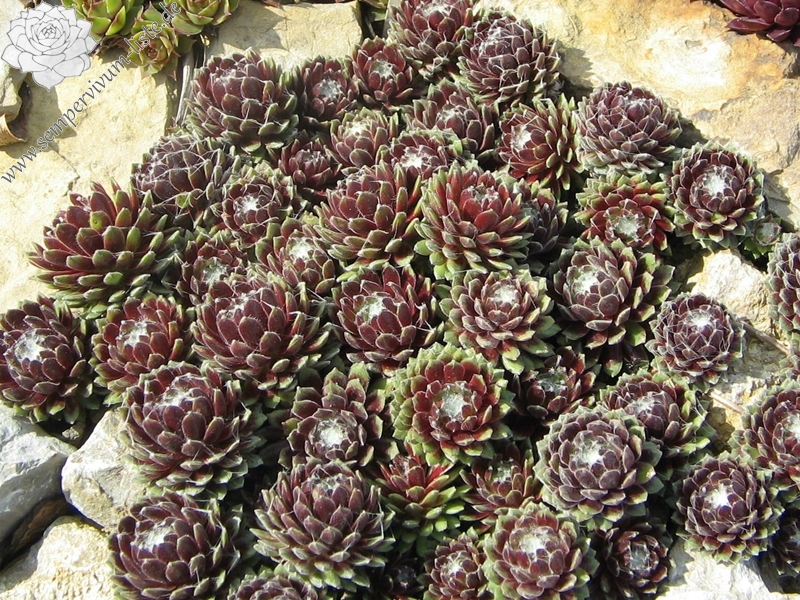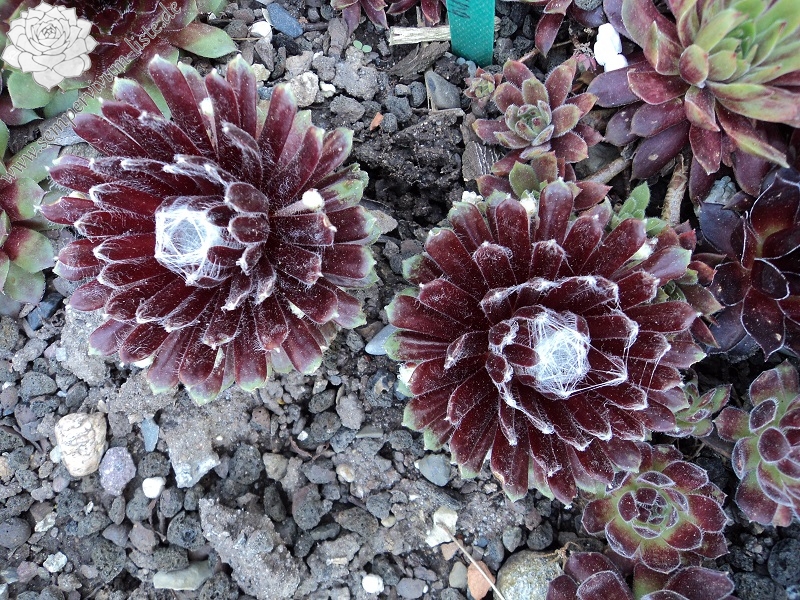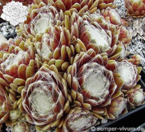 Ein belgisches Kind der 70er Jahre mit stark übersponnenen Rosetten. Der Durchmesser ist für eine Spinnwebhauswurz relativ groß. Zum Sommeranfang verfärben sich die äußeren Blattunterseiten in auffallend ockerfarbene Töne.