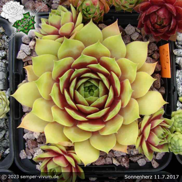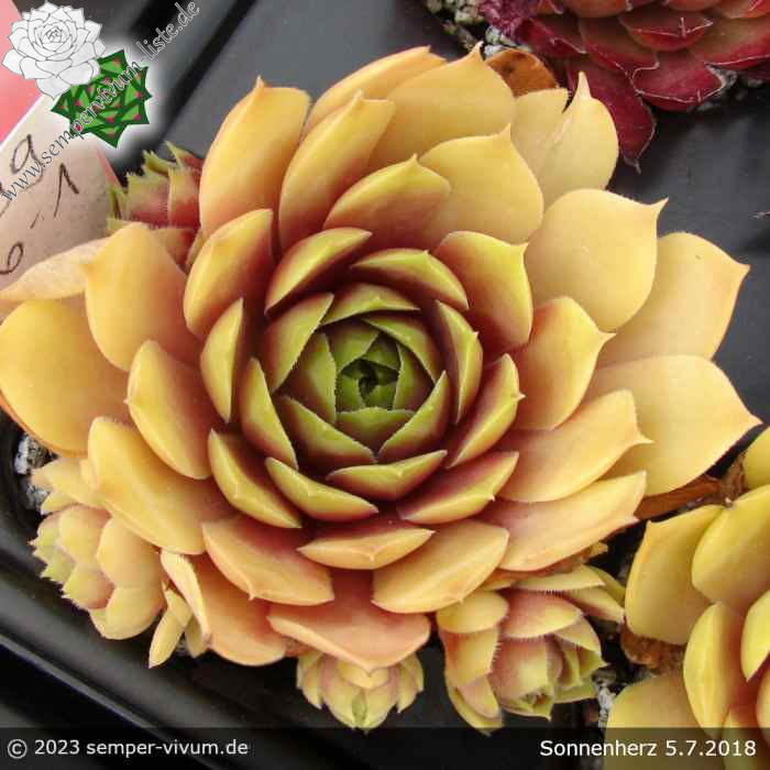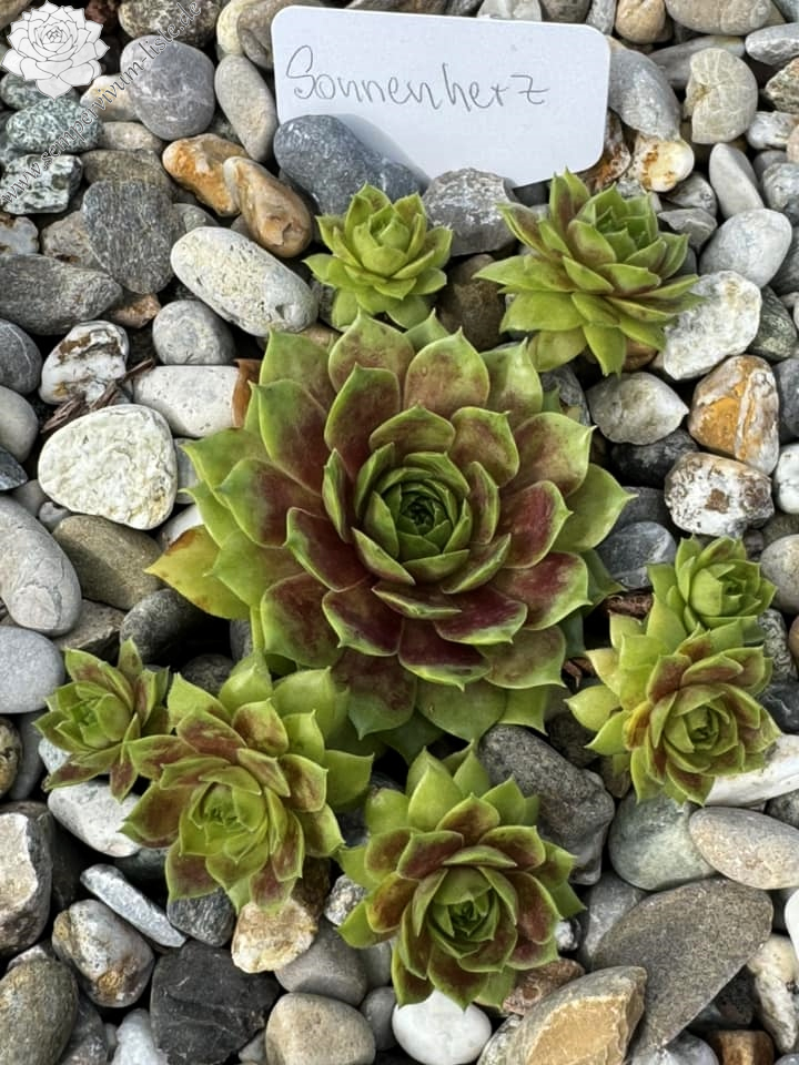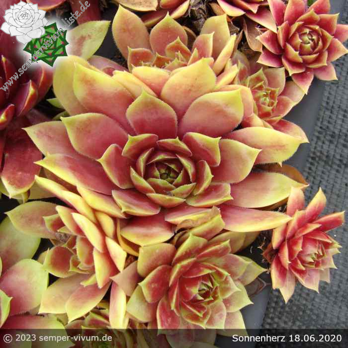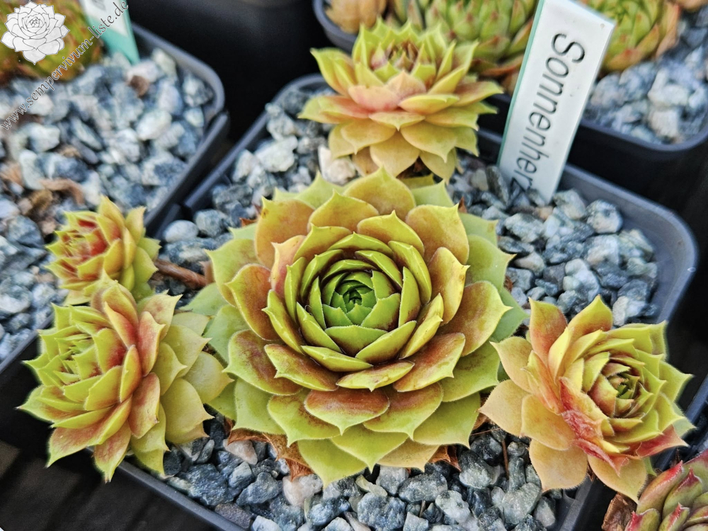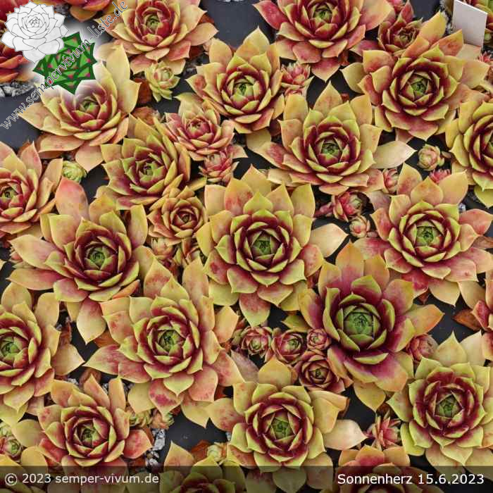 Unsere Auslese formt größere Rosetten, die vorrangig im Sommer mit gelben und orangen Farben aus der Ferne unserer großen Sammlung strahlen. Im Frühjahr und erneut im Herbst färbt sich die Mitte der Rosetten sogar in ein leuchtendes Pink. Diesen Sämling haben wir von Anfang in unser Herz geschlossen - auch eine Sempervivumfreundin ist seit dem ersten Anblick verliebt.