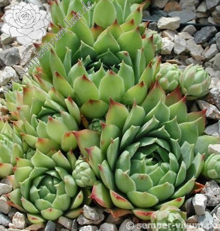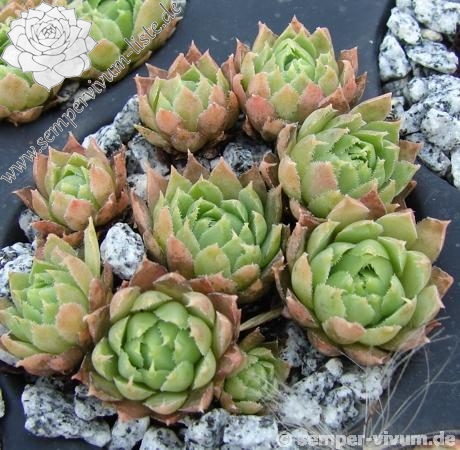 Eine reizende Hybride aus der Schweiz mit auffallend spitzen Rosetten. Sie sind relativ klein mit einer lieblichen jadegrünen Farbe. Die Blattspitzen sind zeitweise leicht bräunlich-orange getönt. Eventuell könnte es sich auch um einen Naturfund handeln.
