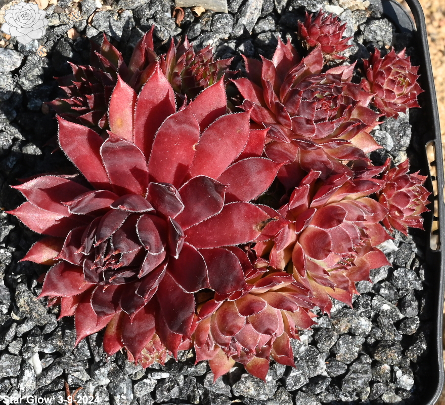 Sempervivum 'Star Glow' bildet größere Rosetten mit einer ganz einmaliger Färbung. Die Pflanzen besitzen eine geflammte Wirkung mit tollen hellen Farben, vermischt mit rotlila Tönen. Eine wirklich auffallende Erscheinung.