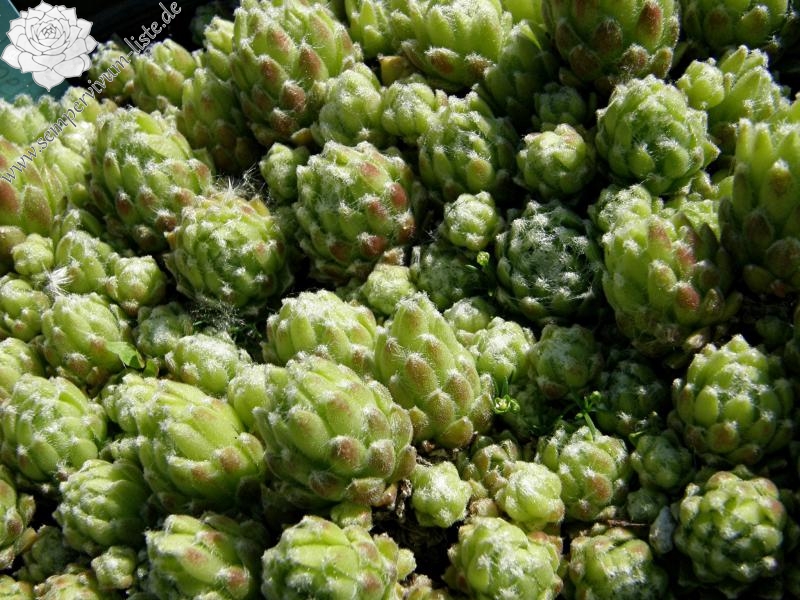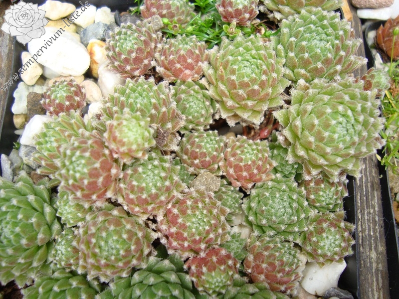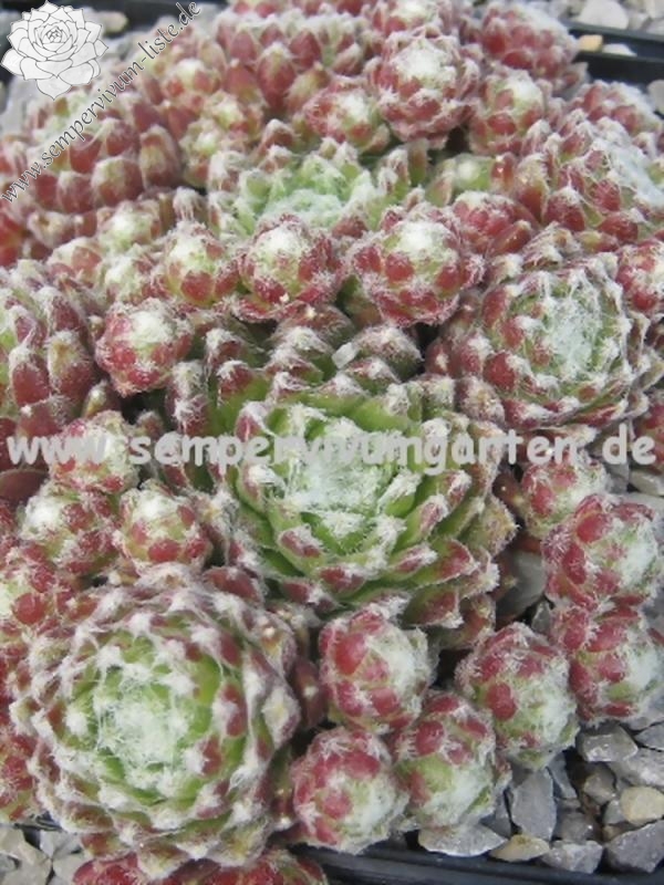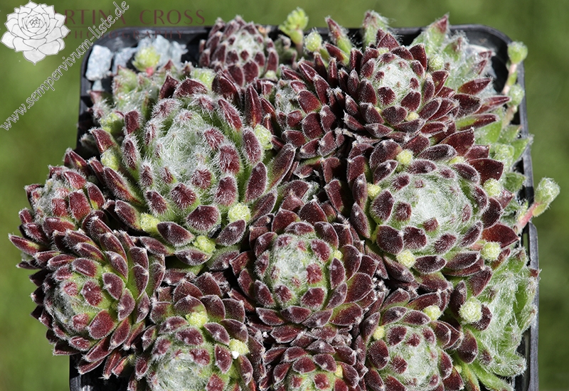 Mit dieser neuen, sehr robusten, gesunden Sorte erhält das große Sortiment von Spinnwebhauswurz eine farbige Ergänzung. Sie zeigt starken Zuwachs und bildet sehr schnell schöne, dichte Polster. Besonders charmant ist die weiße Behaarung, die sich an den Blattspitzen kräftig bildet und sich im Zentrum von Spitze zu Spitze zieht. Die rötliche Färbung an den Blattenden mit dem frisch grünen Zentrum, rundet das harmonische Bild ab. Ein reizvoller, kleiner Nachkomme von S. arachnoideum 'Koko Flanel' der einen Durchmesser von 4 cm erreichen kann. In den letzten Jahren zeigte sich die Pflanze als sehr blühfaul, was aber der Polsterbildung sehr zu gute kommt! Eine Sorte, die sich gut dazu eignet, in jeder Pflanzung für mehr Lebendigkeit zu sorgen.