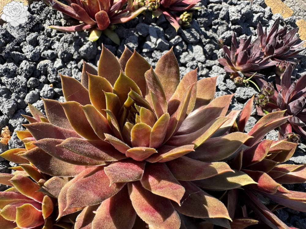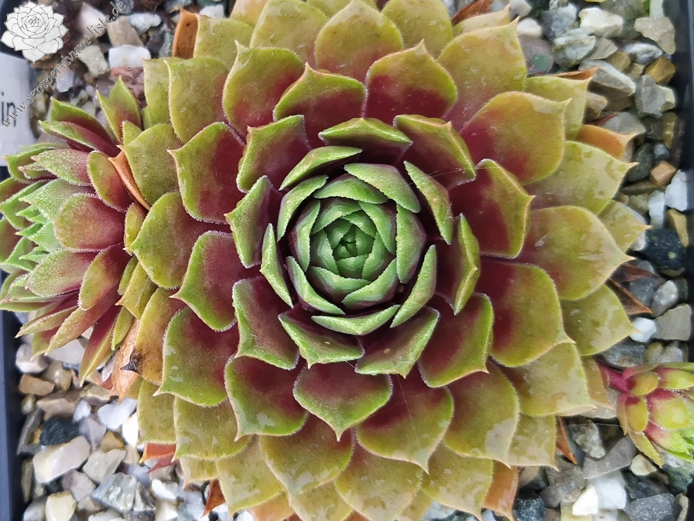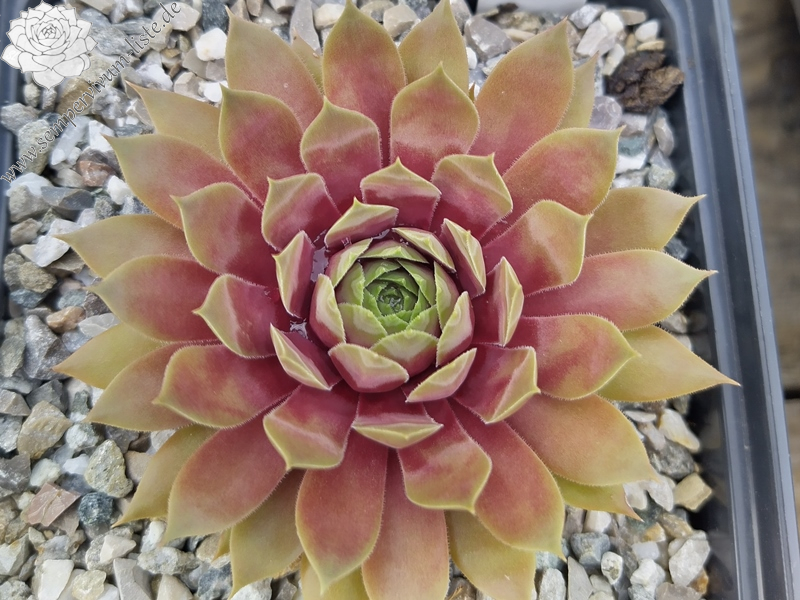 Mit Sempervivum 'Summer Skin' haben wir einen ganz neuen Hauswurz im Sortiment, der im Sommer unglaublich schöne Farben zeigt. Die Rosetten erreichen einen Durchmesser von über 10 cm und besitzen auffallend schmale Blätter. 'Summer Skin' ist wüchsig und bildet ganz dichte Polster. Besonders gut gefällt mir die interessante Rosettenform, mit den langen spitzen Blättern. Die Färbung hält sich lange und verträgt auch höhere Temperaturen. Das warm lilarot gefärbte Zentrum fällt sofort ins Auge und hebt sich deutlich von den Blattenden ab. Die Blattenden besitzen eine helle Färbung und zeigen besonders im Sommer fast hautfarbene Töne. Als kleines Extra besitzen die Rosettenherzen blaugrüne Farben . Die Pflanzen besitzen einen ganz eigenen Reiz und begeistern jeden Sommer aufs Neue. Die Blüten werden gerne von Insekten besucht.