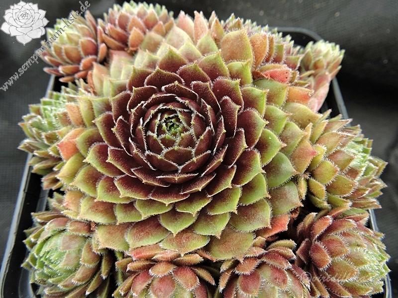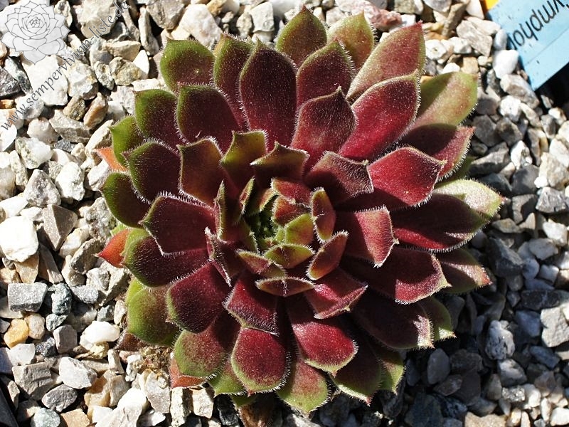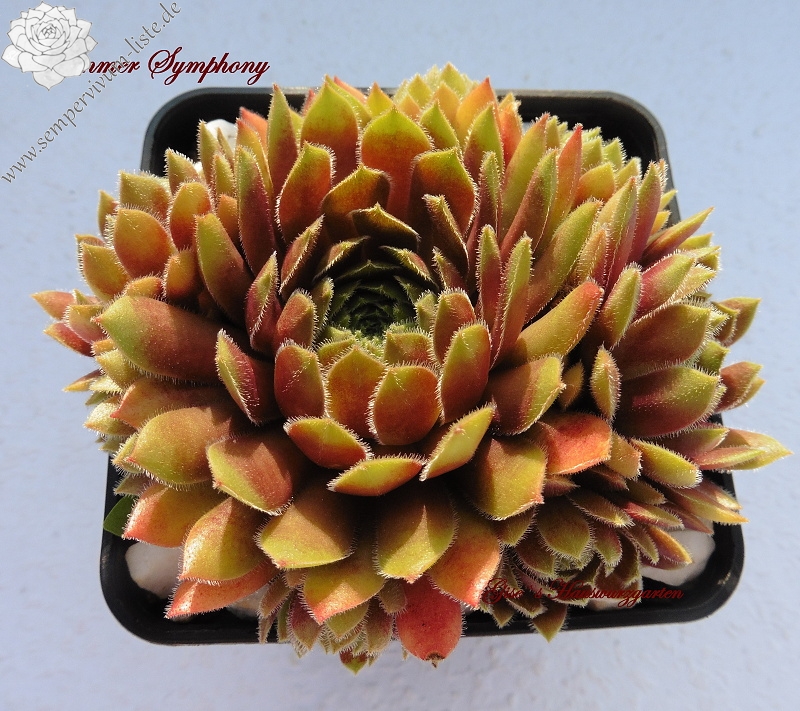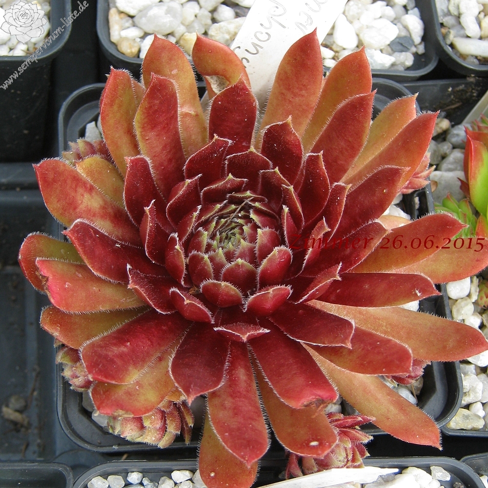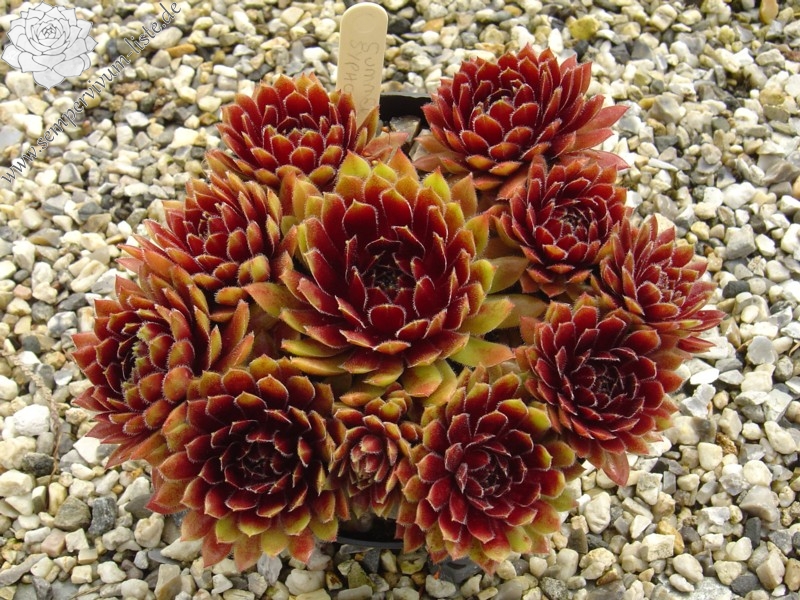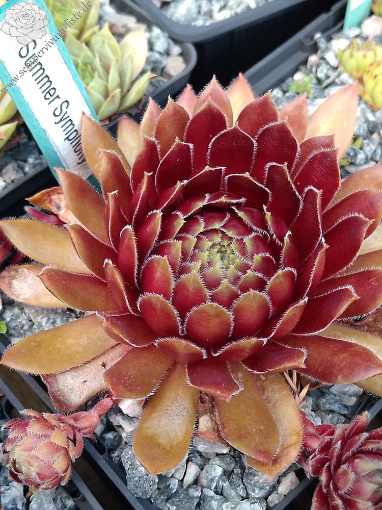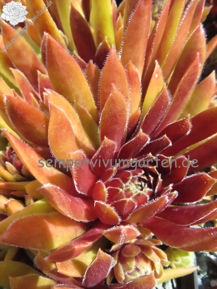 Sempervivum 'Summer Symphony' besitzt rote Rosetten. Die leichte, weiße Behaarung wirkt ganz interessant. Im Sommer zeigen sich oft orange Farbtöne. Die Pflanzen sprossen willig und bilden gute Polster.