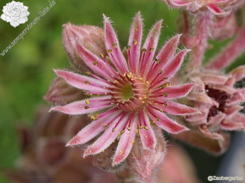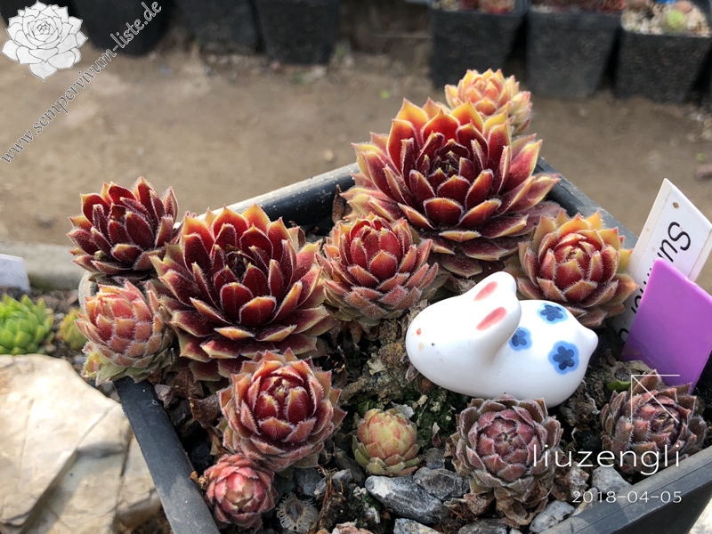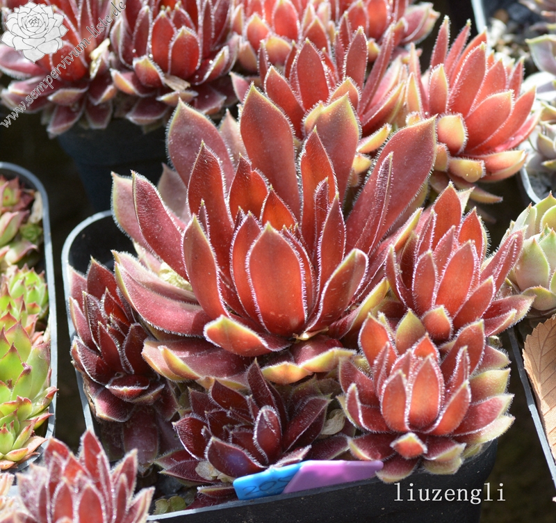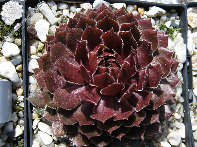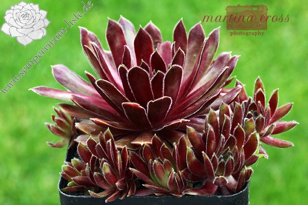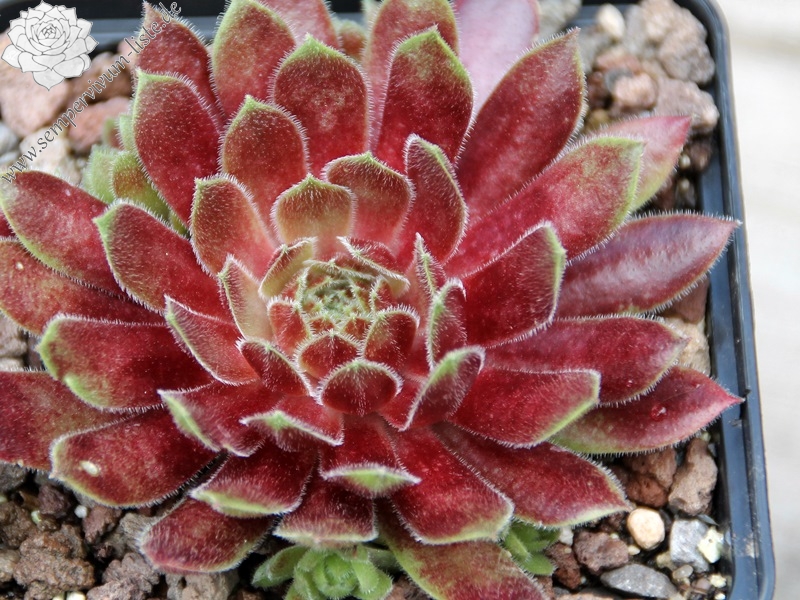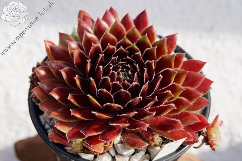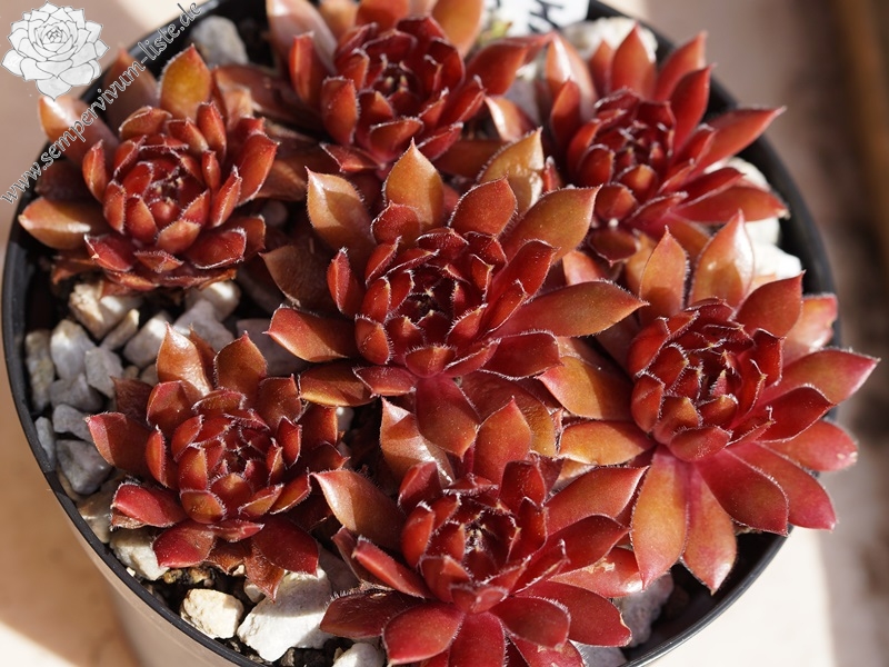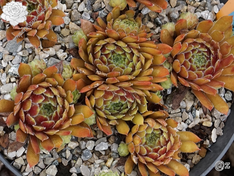 Sempervivum 'Summer Symphony' besitzt rote Rosetten. Die leichte, weiße Behaarung wirkt ganz interessant. Im Sommer zeigen sich oft orange Farbtöne. Die Pflanzen sprossen willig und bilden gute Polster.
