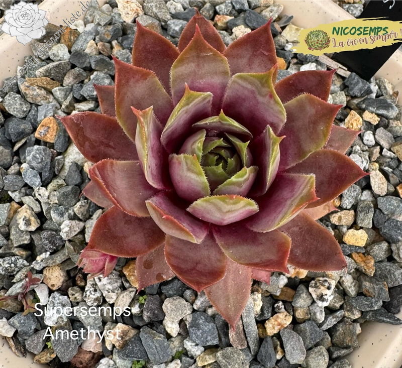 Sempervivum SuperSemp® 'Amethyst': A large growing rosette that flushes a lavender color in time. This plant is a gorgeous and easy as a centerpiece plant for any cold hardy garden. It produces offsets and forms a neat clump given time.