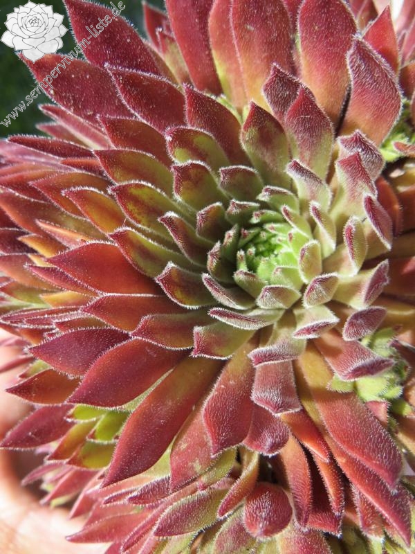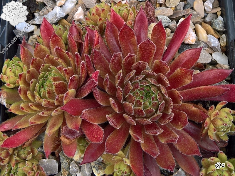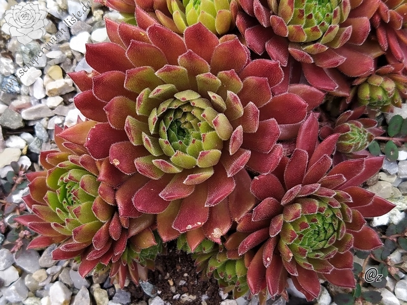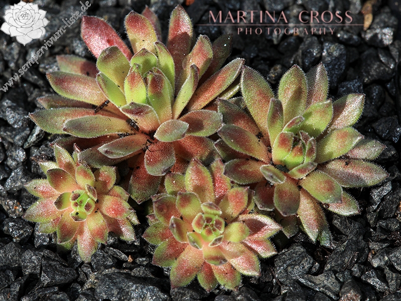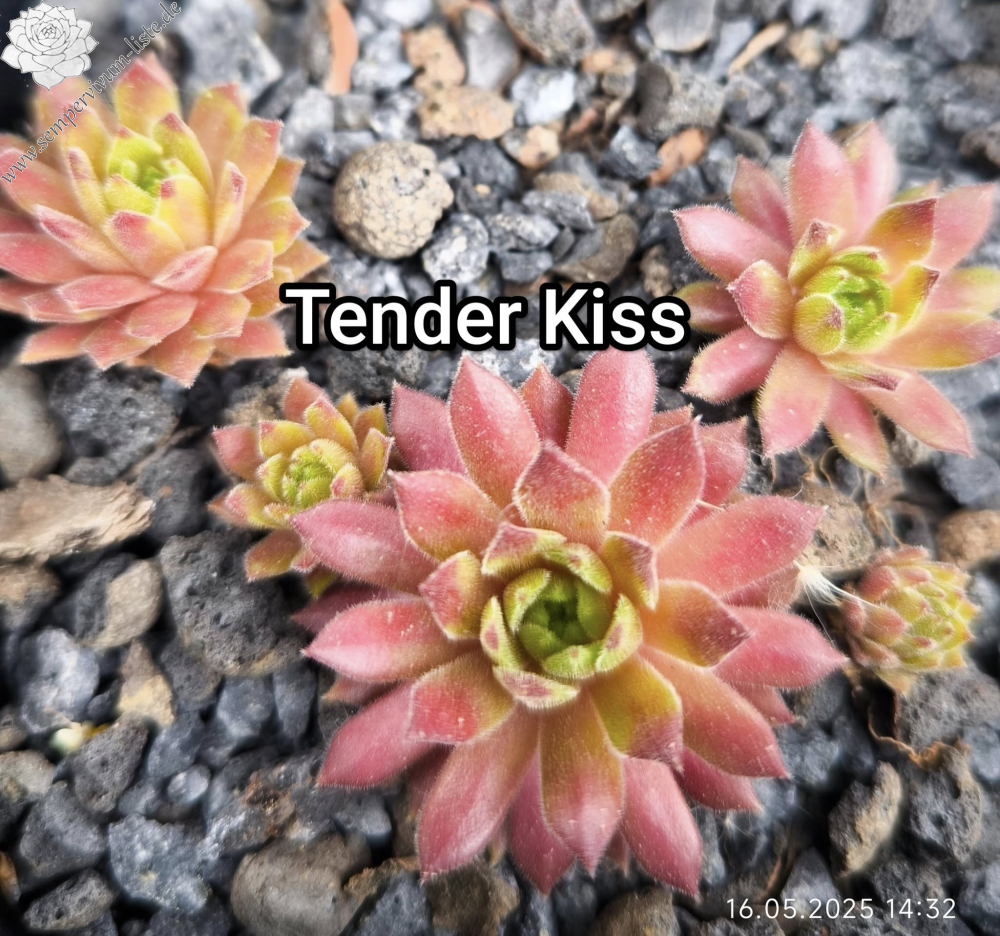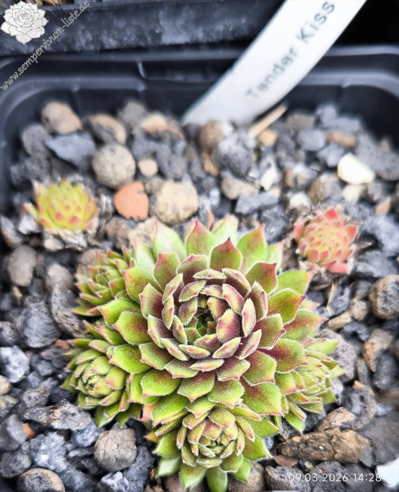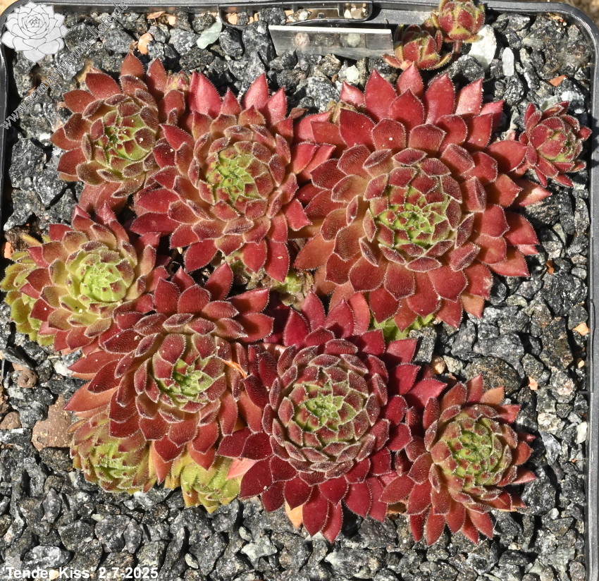 Sempervivum 'Tender Kiss' ist ein mittelgroßer Hauswurz mit feuriger Färbung. Dieser Nachkomme von 'Lothar Denkewitz' ist ein zarter, auffallend gefärbter Frühsommer Sempervivum. Im Frühjahr strecken sich die langen dunkelrot gefärbten Blätter und die Rosetten erreichen einen Durchmesser von bis zu 9cm. Sobald es wärmer wird hellt sich das Zentrum auf und präsentiert sich in fast gelbbeigen Farben. Die Blattenden färben sich kräftig in orange bis blutrote Töne. Eine tolle Zeit für diesen wüchsigen Sempervivum. Im Sommer, in der heißen trockenen Zeit, zieht sich der Hauswurz langsam zurück. Man merkt richtig wie er leidet. Die langen Blätter können von der Pflanze nicht mehr versorgt werden und eine Anpassung ist dringend nötig. Es ist unglaublich wie schnell diese Umstellung möglich ist. Danach sind die Rosetten viel kleiner, meist nur noch 4cm im Durchmesser und zeigen beigegelbe Farben mit schönen orangeroten Spitzen. Ich mag diesen zarten Hauswurz sehr gerne, ein richtiger Verwandlungskünstler!