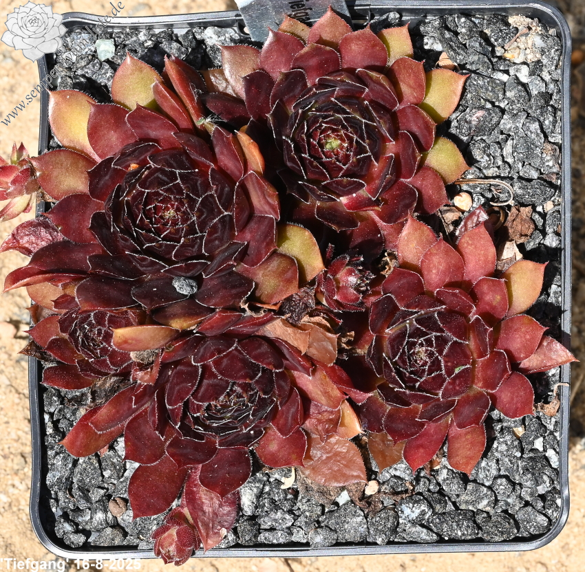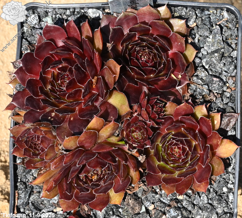 Hier haben wir nochmal einen Sämling von 'Gabrielle'. Die Rosetten erreichen einen Durchmesser von 8cm und sprossen leider nur schwach. Dafür überzeugt er durch seine auffallende Färbung und den interessanten Rosettenaufbau. Die äußeren Rosettenblätter stehen fast aufrecht und das Zentrum liegt tief in der Rosette. Die Pflanzen zeigen eine rotlila Grundfärbung. Die Blattenden färben sich zum Sommer hin immer heller, selbst die kleinen Blätter im Zentrum zeigen leuchtend orangeocker Blattspitzen. Die Blüten erscheinen nur schwach und sind sternförmig.