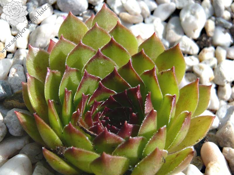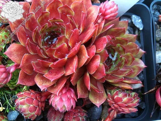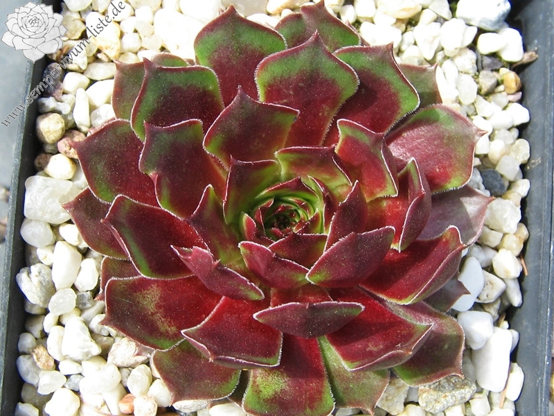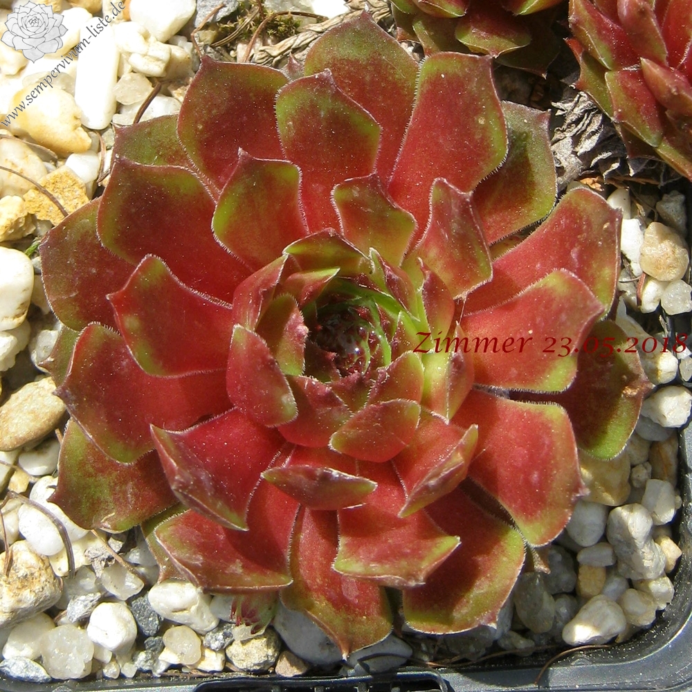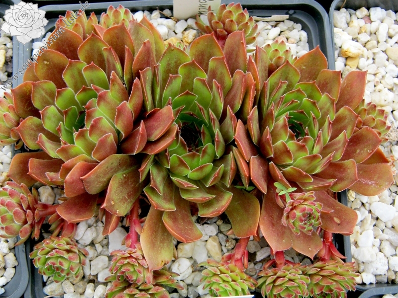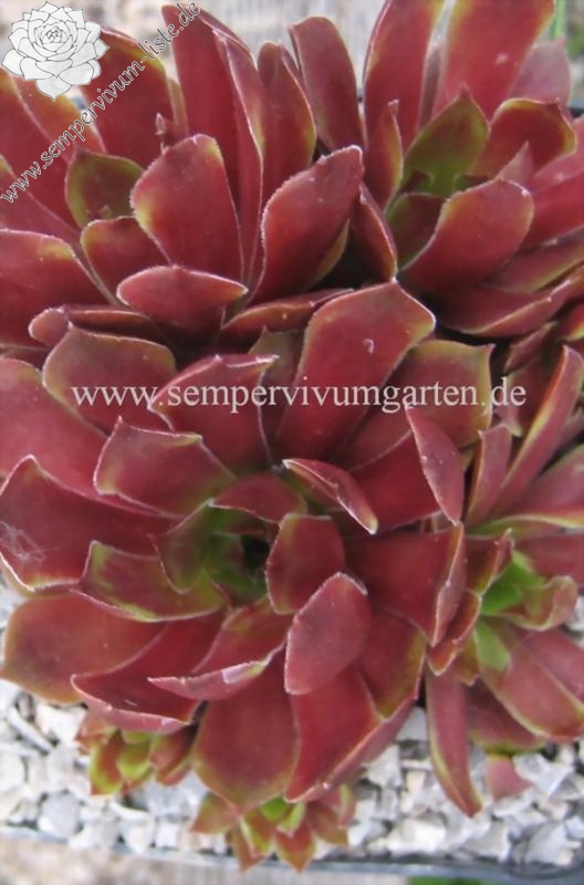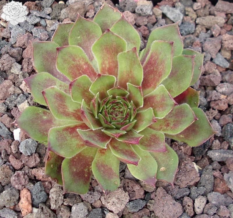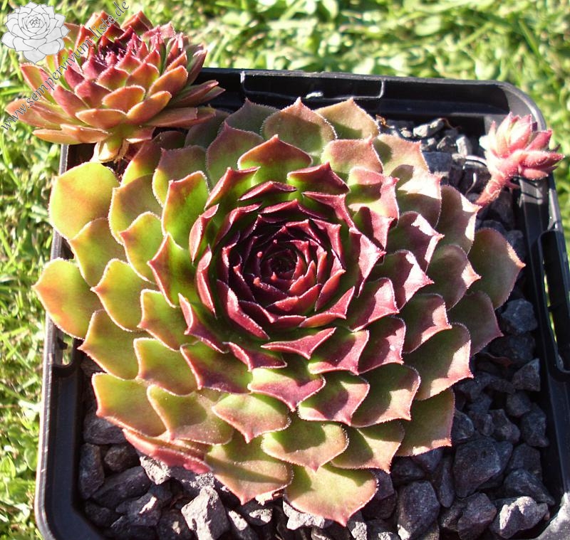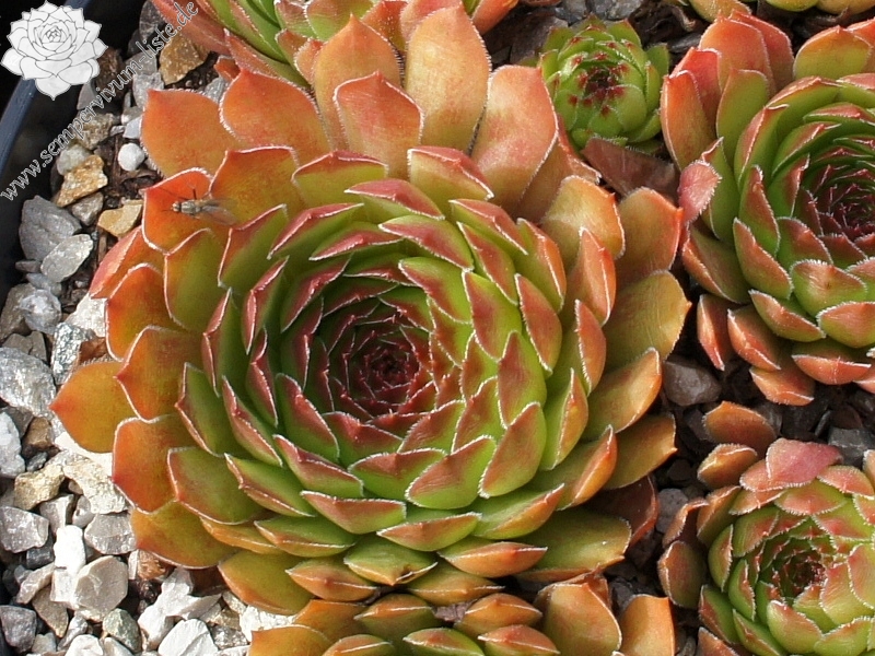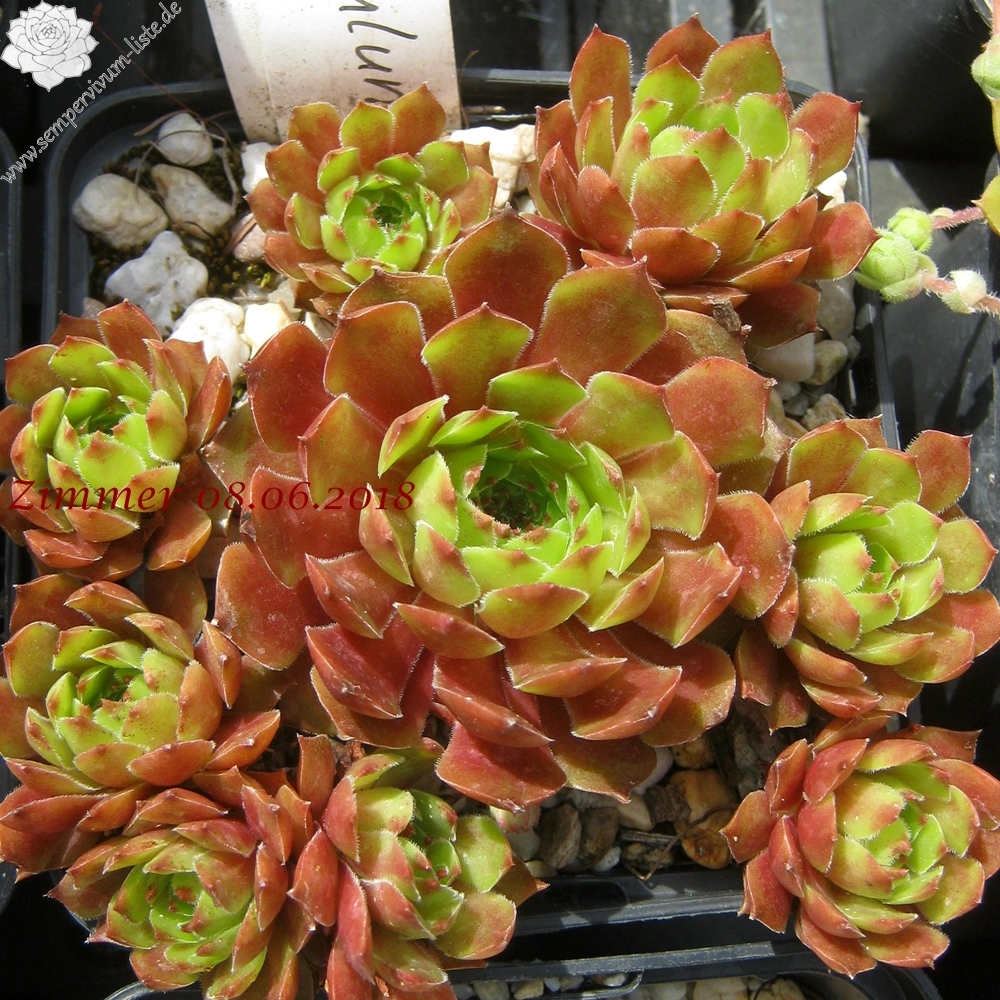 Von Günther Dillmann erhielt ich vor einigen Jahren diese farbenkräftige Hybride: apfel- bis olivgrüne Rosetten, die in den Frühlings- und Sommermonaten hellorange bis rot geflammt sind. Bildet etwas längere und kräftige Ausläufer.