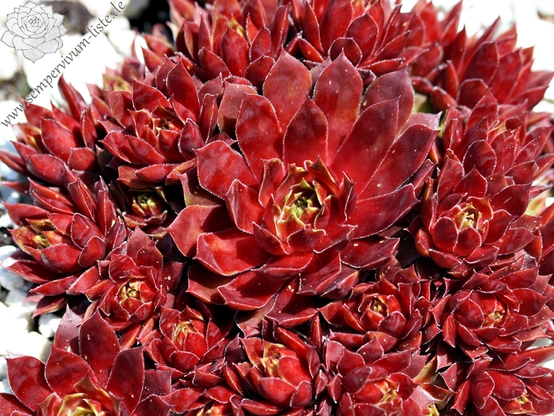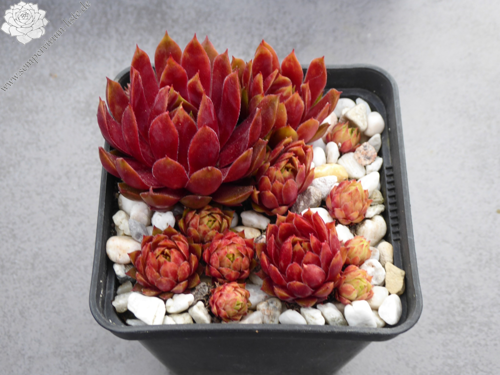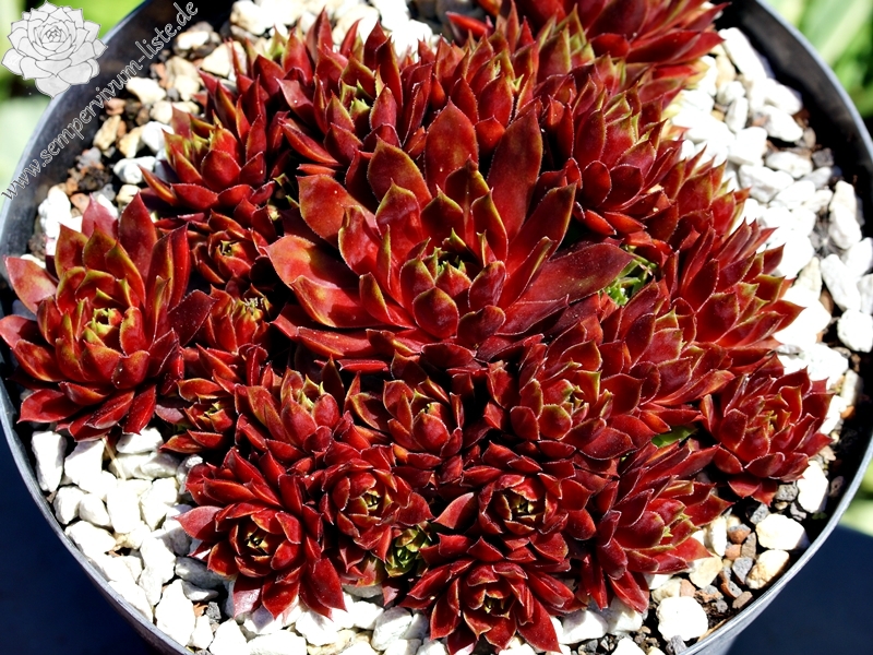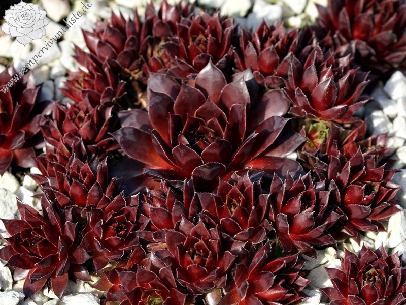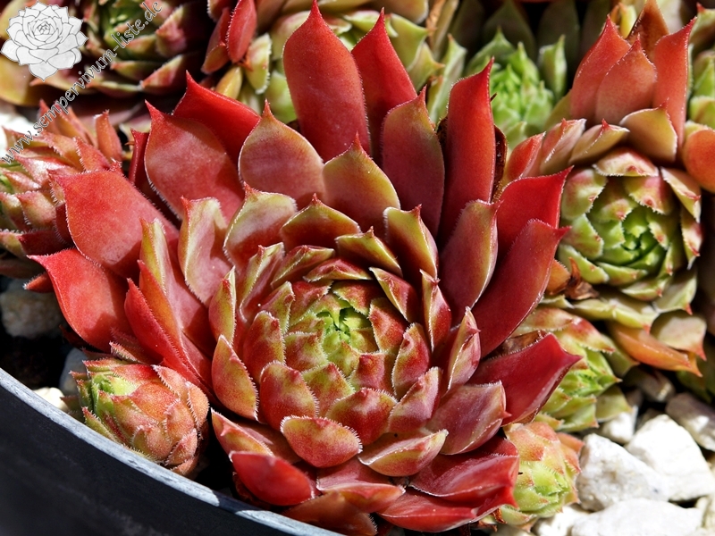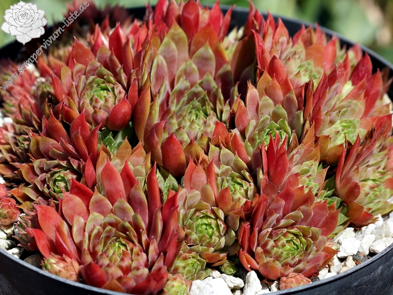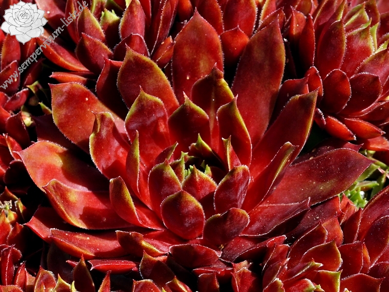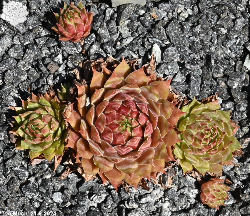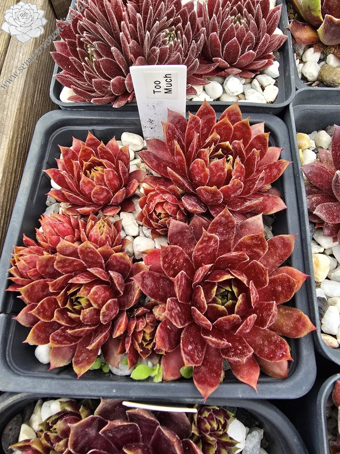 'Too Much' bildet größere Rosetten von ca. 9 cm Größe, mit länglichen sehr fein bewimperten Blättern. Bei Frühlingsbeginn startet sie mit bordeauxroten Blättern, die am Blattgrund beginnen hellrot zu leuchten. Anfang Mai ist sie feuerrot, das Herz zeigt strahlende gelbgrüne Spitzen, die auf der Rückseite leicht marmoriert sind. Die Sommerfärbung wirkt sehr bunt, wie aquarelliert. Das kompakte Herz ist hellgrün und die Blätter werden nach außen hin immer mehr mit einer rosafarbenen Tönung überzogen. Die äußeren feuerroten Blätter recken sich nach oben und erzeugen so eine Flammenwirkung. Auf den Blattspitzen sitzen rote Dornen. Sie ist eine robuste Sorte, vermehrt sich sehr gut und bildet schnell ein größeres Polster, außerdem ist sie frosthart und unempfindlich bei großer Hitze und auch bei langen Regenperioden.