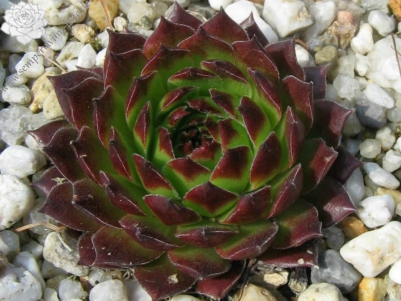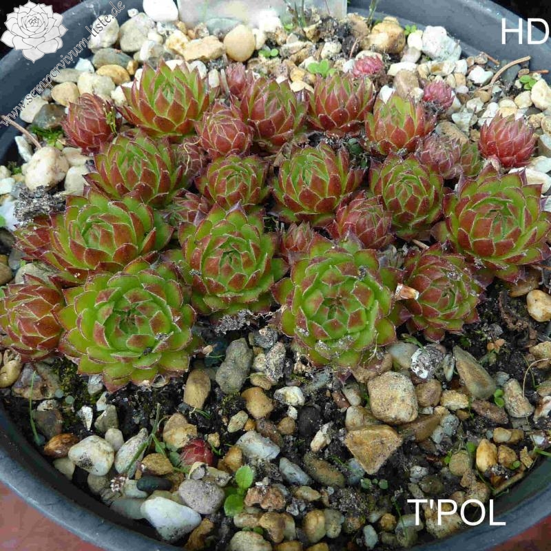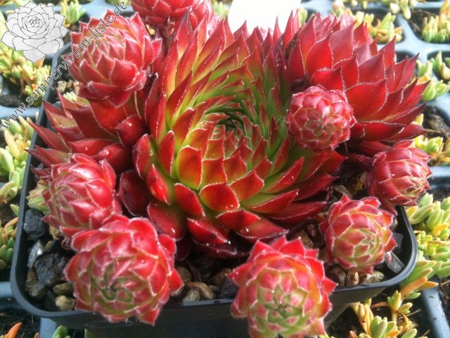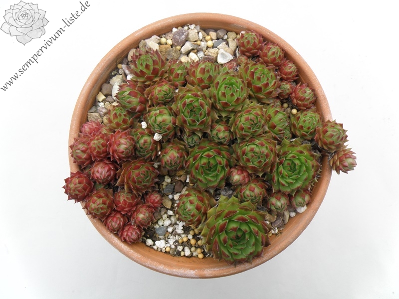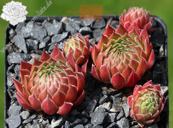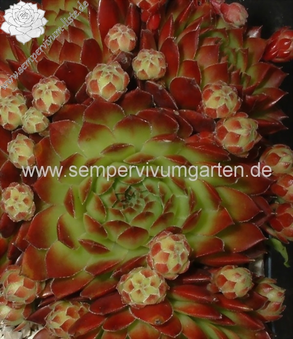 Diese Neuheit erreicht einen Durchmesser von 7 cm und hat eine knospige Rosettenform, die man eigentlich mehr von ‚Jovibarba hirta' kennt. Die Grundfarbe ist ein frisches Grün, wovon sich die leuchtend orangroten Blattspitzen deutlich abheben. Auffallend sind die Ausläufer, die im Frühjahr zahlreich erscheinen und steil aufrecht nach oben gestreckt werden. Sie sind anfänglich grün mit kleinen orange Spitzen, im Sommer jedoch zeigen sie einen knallroten Farbton und sind kugelrund. Die Pflanze fällt den ganzen Sommer durch ihre leuchtende Farbe auf, die sich auch bei langer Trockenheit mit Hitze nicht abschwächt! Interessant ist auch, dass die Pflanze bis jetzt noch keine Blüte gezeigt hat! Ein besonderer Schatz der schon als kleiner Sämling wegen der intensiven Rotfärbung auffiel!