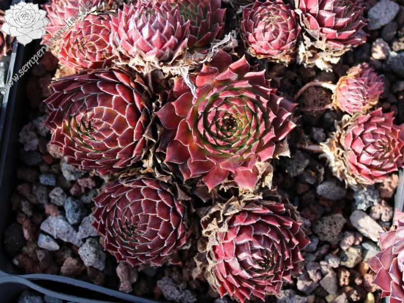 Leuchtende Rosetten zeichnen diese neuere Sorte aus. Die auffallend knospigen Rosetten messen einen Durchmesser von ca. 7 cm. Eine Auslese aus der Absaat von S. arachnoideum 'Koko Flanel', gezielt bestäubt mit der türkischen Lokalform Sempervivum sp. from Nemrut Dag.